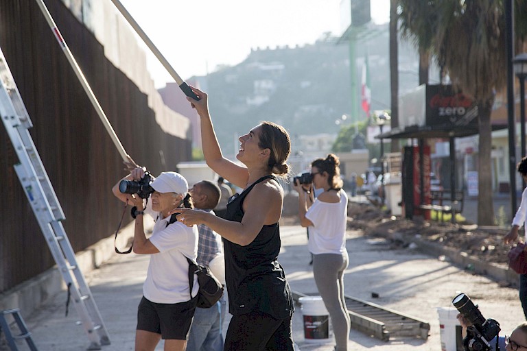A residency organized by Mary Stephens, Director of Arizona State University’s program Performance in the Borderlands, provided Fernández with the opportunity to propose a new iteration of the project. Following talks and workshops in five Arizona cities, on October 13, 2015, about 40 volunteers joined Fernández on the Nogales, Mexico, side of the border to paint out a section of the fence. Painters ranged from ASU students and professors who traveled hours to participate to passersby who spontaneously joined in, from a border police officer to a deportee.