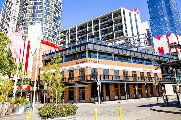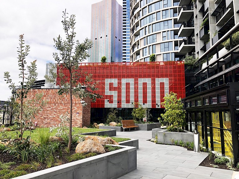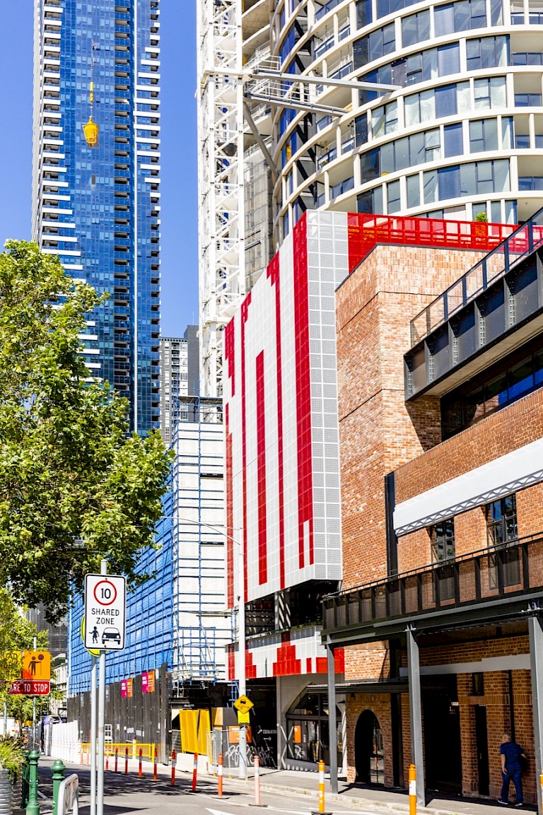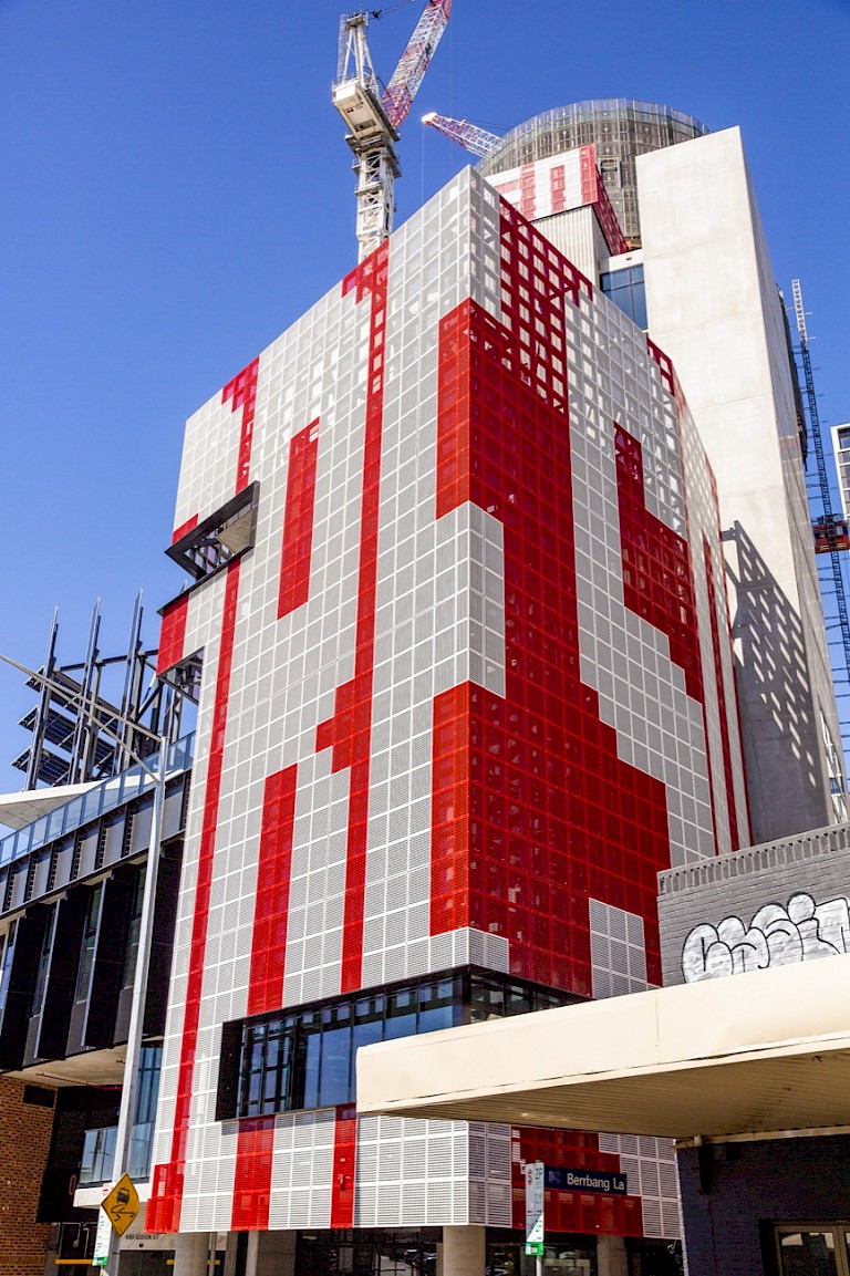 Rose Nolan has long played with extremes of scale in her art practice, often employing wry texts in her large-scale and text-based public art works. Consistent with her practice, for Screen Works (ENOUGH-NOW/EVEN/MORE-SO) Nolan employed a rad¬i¬cal¬ly reduced palette of red and white, using and sim¬ple util¬i¬tar¬i¬an mate¬ri¬als and meth¬ods in an explo¬ration of per¬son¬al, play¬ful and often self-effac-ing nar¬ra¬tives. Fully integrated into the structure of the building, Nolan’s bold responsive artwork both crowns and forms a dynamic facade of the new 10-storey building’s design, one of many links the art work creates to site and community. The Queen Victoria Market (QVM) is an inherently layered site with a complex history currently in transition. Referencing the market’s role in social and economic exchange, Nolan’s work is a key aspect of the QVM Precinct Renewal plan, a major body of work seeking restore the market’s heritage while delivering modern facilities and revitalising a growing part of the city. Nolan comments that “Screen Works… aims to contribute an optimistic, complex and bold design to the screen facades of the Munro Community Hub. As a series of connected words, they conjure up a sense of perseverance; of change; of forward thinking and improvement to transition from one state to another.” Highly site specific and respon¬sive to the unique context of the QVM area, in Nolan’s art work it is clear that seriality and rep¬e¬ti¬tion can be effective tools in large scale outdoor art works, and the impor¬tance of lan¬guage, inter¬ac¬tiv¬i¬ty, and the expe¬ri¬ence of the viewer in place-making public art. Nolan describes the work as a ‘verbal-visual puzzle’ and her text-based propositions – which can be seen from a great distance – act to prompt viewers into engaging with their interpretation. Nolan’s choice of words aren’t obvious but thought provoking and somewhat questioning of development and change in the city and the market precinct which is surrounded by dense redevelopment. In a world where much culture has become simplified and easily delivered to the consumer, Nolan instead teases meaning and wraps her audience into the art work, allowing intention to be approached from awry and collectively. Exploring materials, typography, patterning, and abstract form, Nolan creates an intriguing and surprising anchor-point to the Munro Site Western Hub, a conceptual and modernist work as a counterpoint to the historic area. Scale is a crucial means by which she negotiates and frames the public nature of the site. Screen Works… is architectural in scope, a match for the 10 story building that thoughtfully exploits the inherent graphic nature of text. Nolan uses text as material object – ‘found’ text that is derived from the everyday where words are chosen for their visual presence, formal qualities and linguistic content.