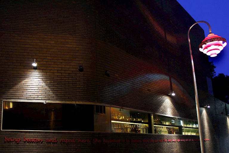 A Lamp for Mary by Sydney-based artist Mikala Dwyer was commissioned and installed in Mary’s Place in 2010. The singular and seemingly traditional street lamp is made from anodized aluminum and stands proudly in the lane. The unique lighting fixture is in the form of a red, multi-ringed and double conical shape, reminiscent perhaps of a traditional lampshade one might find in an art deco home. At night, the lamp casts a pink glow in the lane creating a meditative sense of place and remembrance, while providing adequate lighting for the safety of passersby. The artist consulted with representatives from the GLBT (Gay Lesbian Bi-Sexual and Transgender) and other community groups including Haughton Design, Wesley Mission, NSW Police Force, ACON Anti-Violence Project, St. Michael’s Anglican Church, ACON Young Lesbians Project, and Twenty10. A plaque displays a poem, written in collaboration by community representatives and poet, Michael Taussig. It reads: