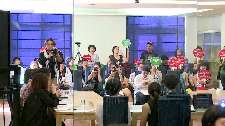 that discussed migrant workers issues from a variety of perspectives from various individuals in English, Chinese and Bahasa Indonesian. Using anecdotes and real-life examples, the artists brought a complexity of social, cultural, economic, human rights and legal matters to the forefront to explore emotions, aspirations and the human condition. In addition to the invited speakers, in attendance, as audience members were an estimated more than 30 individuals who were given placards and could "agree" or "disagree" with the statements being
