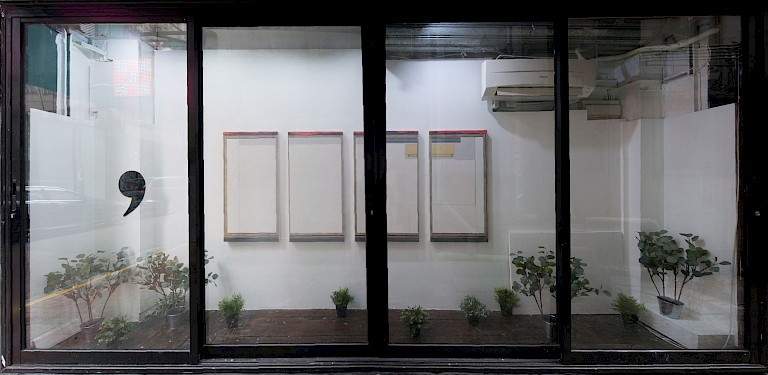 The duration of each chapter and its content not fully fixed before the project launched. Each chapter emerged out of the artists’ off-site discussions and their gradually accumulating physical experience of the place. Chapter 1 focused on the artists’ personal memories of back alleys. The artists began by observing the locality of the venue and making sense of its physical presence in relation to their bodies and the surroundings. In one preparatory discussion, the idea of the comma came up. It was regarded as offering a hinge with which literature and visual art, specifically painting, could be abstracted into a different layer of meaning. There were also discussions about how the literariness of poetry and qualities of the lyrical in words could be translated into a three-dimensional space. In Chapters 2 and 3, the artists presented a total of 11 poems over a six-week period. The installation built onto Chapter 1, while shifting artistic attention away from the alley towards the shop itself, imagining it as a page in a book, a picture frame, etc. Chapter 4 presented poetry that was less narrative in content and style. Visual tactics that deliberately disrupted the linear format of writing and reading were used. There was no clear beginning or end of the poem that was inscribed in the space. Texts were also presented in multiple layers, materializing them as interwoven tissues (alluding to the idea’s etymological origin). Chapter 5 developed the layering tactic further: the emphasis was on a clash of textures between computer-generated characters printed on vinyl and traces of the hand in paintings on canvas. Some characters were broken up, others blotted out. While still legible, they took on a rhythm that seemed to sound out the action of printing itself. Chapter 6 as the last chapter returned to a more minimalist set-up. There was only one line of text, and one set of paintings that depicted A3.