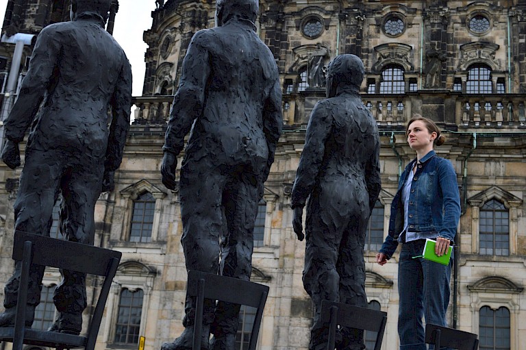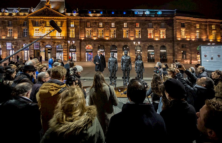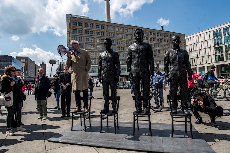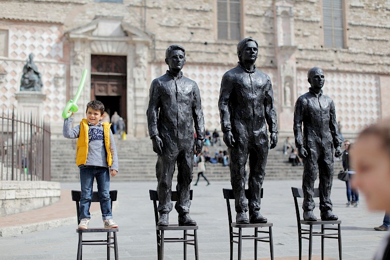 “Anything to say” is an art project born by the meeting between the Italian artist Davide Domino and the journalist Charles Glass in 2013. The project consists in a life size bronze sculpture group, representing the figures of Julian Assange, Chelsea Manning and Edward Snowden standing on three chairs; with their arm along their body, and an eye forward, they are looking to an imaginative public; next to them there is an empty chair, as an open invitation to the public to stand on it. Davide Dormino himself believes in the power of Public Art. « It has the power to make people grow and change their point of view. The chair has a double meaning. It can be comfortable, but it can also be a pedestal to rise higher, to get a better view, to learn more. They all chose to get up on the chairs of courage. They made their move in spite of becoming visible, thus threatened and judged. Some think they are traitors. History never had a positive opinion of contemporary revolutionaries. You need courage to act, to stand up on that empty chair because it hurts.»