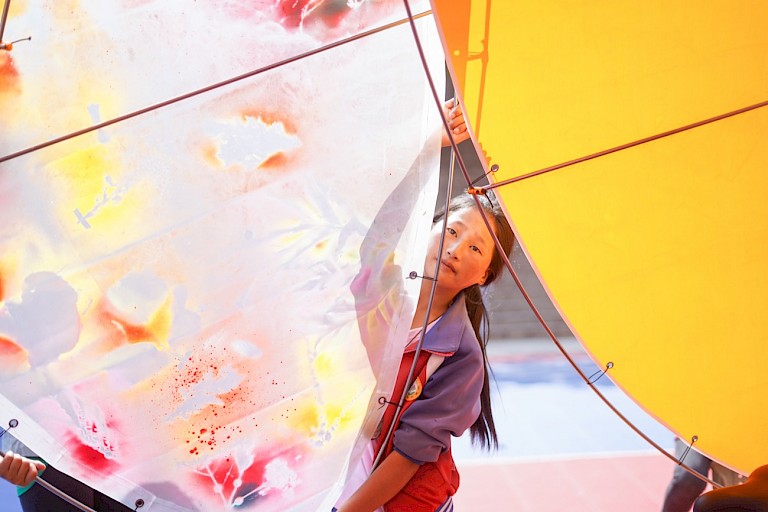 In actual teaching in the Yi Autonomous Prefecture, many children can only listen and speak but not read or write the Yi script. Coupled with the fact that language learning itself can be boring, the Yi script has gradually become marginalised. Blooming transforms the reading and writing of Yi script into a highly interesting art creation experience through public art, stimulating children's interest in learning through positive and creative experiences, thus ""seeding"" appreciation and knowledge to encourage subsequent study and use.