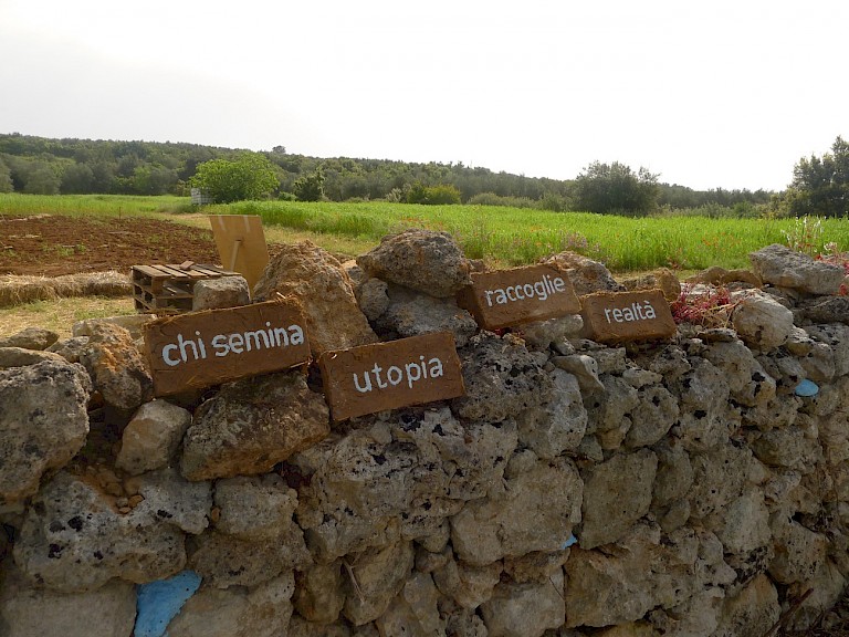 In economic terms, Casa delle Agriculture provides an important impulse to the local supply chain, operating a transition from the logics of competition to that of cooperation by building two infrastructures: The Community Mill (Il Mulino di Comunità) and the Inclusion Nursery (Vivaio dell’Inclusione). The Community Mill, is a multipurpose processing center for quality cereals and will serve to restore value to cereal and legume biodiversity to combat depopulation in the rural areas of Salento and to promote a healthy agriculture, that is, to practice food democracy. It is the first experiment of this kind in Italy. At the Community Mill, anyone is able to bring their own harvest and take advantage of a milling service at fair costs, to guarantee everyone the right to healthy and quality food. Everyone has access to it, as the stone mills are the only alternative for the production of quality and tasty flours. It is only this type of grinding that allows the germ, the most noble part of the seed, to be preserved. On the contrary, the industrial method processes larger quantities but refines, overheats and depletes the flours of vitamins and proteins. The Inclusion Nursery, results from the donation of the people’s lands of free loan for use, with even twenty-year contracts, where the Casa delle Agriculture collective started growing cereals, vegetables and minor fruits as like as a small biodiversity nursery by recovering, selecting and reproducing forgotten seeds. As explained by the artist, they were distributed to farmers to free them from the monopoly of agrochemicals, to convince them to return to natural agriculture without pesticides. It is called « Inclusion Nursery » because people with disabilities, migrants and the elderly also work there not only as an action for social justice, but equally for their extraordinary importance for our community and their precious non-written knowledge.