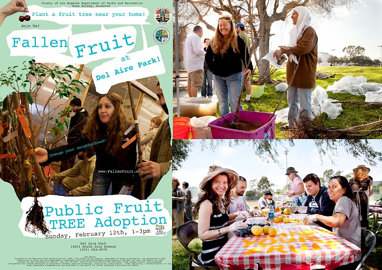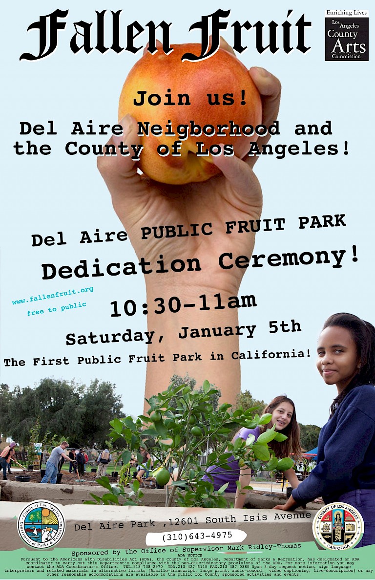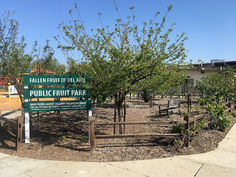 In addition to serving as a meaningful public art project in its own right, Del Aire Public Fruit Park functioned as a testing ground that gave L.A. county confidence to further welcome fruit trees on public spaces. Additionally, the project underscores the intertwined nature of public and private realms, as well as the ways in which communities can be reconceived as nourishing spaces. In this vein, it fits alongside initiatives related to healthy and locally sourced food, as well as within an arts and activism landscape that ranges from Guerilla Grafters’ rogue interventions to add fruit bearing branches to public plantings to Fritz Haeg’s Edible Estates, where participants transformed their own front lawns into nutritious gardens.
