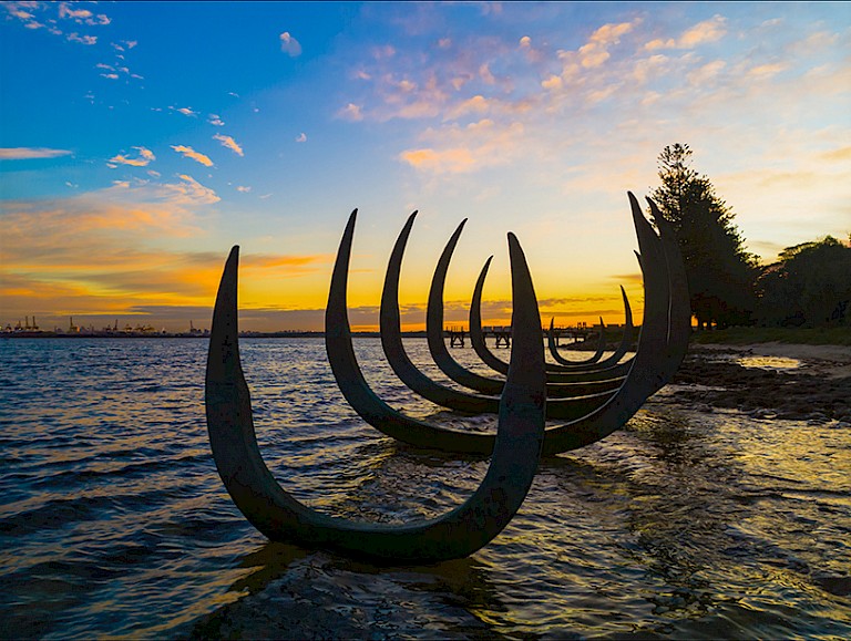 This art work combines ancient and modern Australia’s shared history by integrating the stories from the ship and the shore into a single artwork. The first encounter between James Cook and the First Australians was a meeting of two very different knowledge systems, beliefs and cultures and the abstraction of the ribs of the HMB Endeavour and the bones of the Gweagal totem the whale, are devices the artists intend to speak to the different perspectives of those first encounters, providing a conjoined narrative of two very different world-views. The artists worked closely with the La Perouse Aboriginal community via the Gujaga Foundation to gather local histories and contemporary stories, later cocreating designs for the sculptural artwork, intending the resulting artwork to embed refreshed and revived narratives of history and connection to the land at the Meeting Place, strengthening the significance of the Kamay site to all.