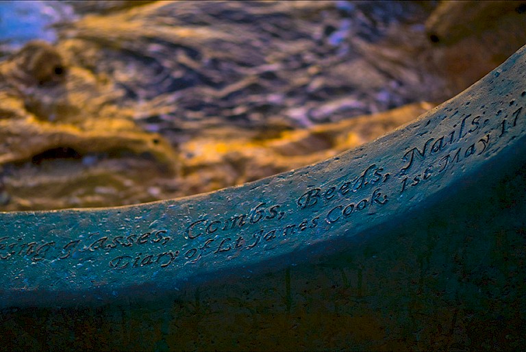 Content inscribed on the ribs focuses on the 8 days that Cook and his men spent at Kamay as seen from both the ship and the shore, referencing how these stories intersect. It represents the juxtaposition of these perspectives from the first encounter on ribs 1 and 2; plants collected by ship botanists Banks and Solander but with their indigenous names (Ribs 3 and 5) and the objects offered and taken by Cook and his men (Ribs 6 and 7). An amalgam of two very different forms, the commemorative installation attempts to speak to the different perspectives of those first encounters, aiming to evoke “a sense of sentiment, mutual understanding, and reflection on the events of 1770”.