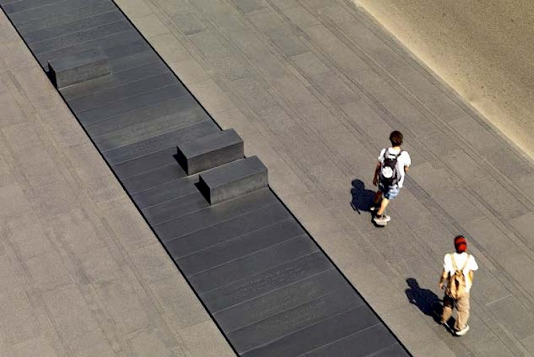 The boldness through which the artist has insistently created the memorial devoid of full physical representation of the subject, without sculpturally mentioning him in visage or shape, presents a relatively new manner in which the public can interact with the contemporary presence of Tueni’s legacy. Instead of remaining a memory external to public interaction, every part of the memorial exhibits truly public values, namely its practical use as a walkway. The artist has also allowed for the public to interact with the memorial even subconsciously, as they walk past, over and through the memorial, it represents the subject’s presence in Lebanon’s society whether that society remember him actively or passively.