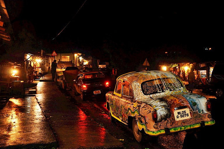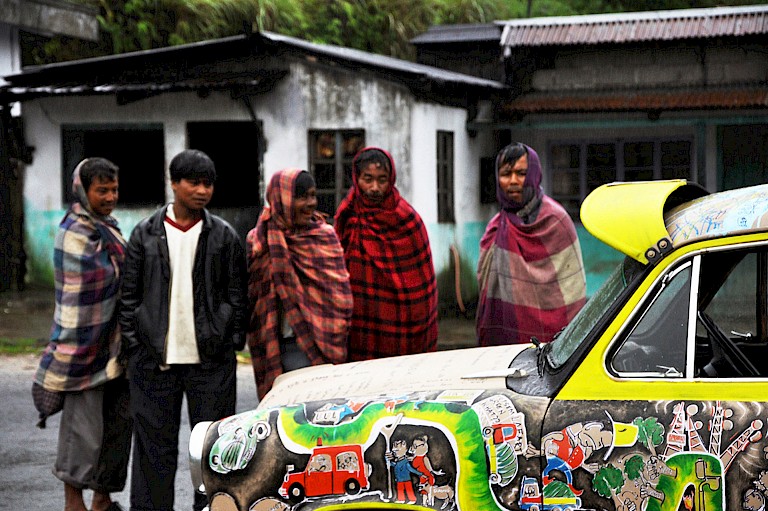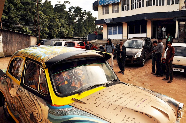 In doing so, Diengdoh obtained an automobile and altered it to become a traveling exhibition—as well as a functioning taxicab. Artists painted traditional Khasi oral histories on the exterior of the car, while inside a variety of interactive elements were deployed including a touch-screen computer that displayed scenes from both present-day and historic Shillong, and a soundtrack that mixed music with recorded conversations from other Kali Kamai and found-sound from radio broadcasts of the 1970s and 1980s. Instead of collecting a fare, the driver gave out kwai, a traditional snack of betel nut with paan leaf that is universally seen as a gesture of welcome.