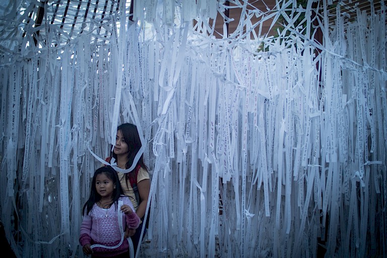 The grotto served as a central gathering space that featured a copy of the painting, Mary, Undoer of Knots, but it was also part of a carefully crafted environment with landscaping, hand-built tables for writing, a fountain, nighttime projections, and strands of ribbons extending outward and connecting to surrounding structures. Originally envisioned as a place-based work, interest in the project grew and inquiries began coming in to the artist’s studio, asking how those who could not physically visit the work could participate. The studio created a machine to cut mural cloth and began mailing out ribbons and adding the struggles sent back to structure.