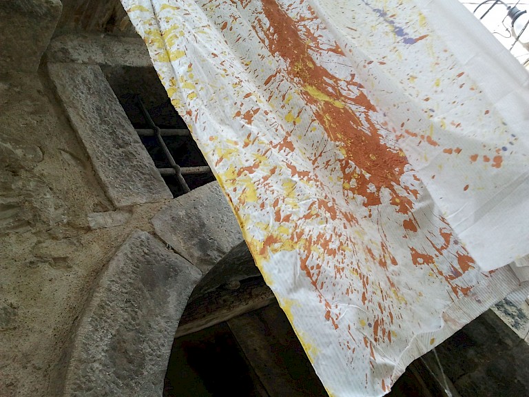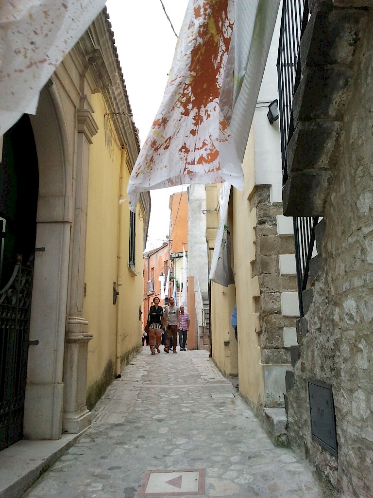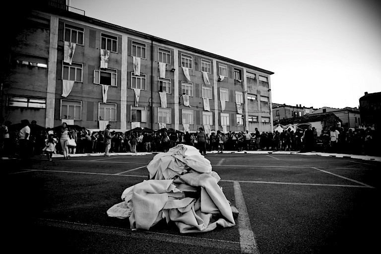 The story of the sheet, as it was told, was not a true story, just a story of a few sentences, which did not explain but generated phantasmagorical and terrible images on the wedding night and the end of virginity. The origin of this custom indeed dates back to a distant past. Perhaps there will be a thread that unites it with the hymen songs of ancient Greece, the mysteries of virginity and the sacredness of reproduction. However, the ash that remains of those ancient fires has generated a desire for redemption, embodied by the project “L’esposizione del lenzuolo” literally meaning “the exposition of the sheet,” is a collective action aiming at reshaping the tradition, with the purpose of subverting its meaning. It is an art project conceived and realized with the female population of different towns in Italy where the memories of this custom survive. The project develops in different phases. It starts with personal contact with the population of a chosen place and works on social involvement through meetings and talks with the local women. Later, the event consisted of the collective performance, and with the exhibition of the sheets realized during the performance in the oldest part of the town. The event was realized for the first time in Calitri (AV) in August 2013, on the occasion of a festival of the Sponzfest; it has been brought to the city of Matera for a second edition and in other small towns in France. It is a collective action carried out with people in all its steps: from colors to locations for installations, from performance solutions to the words of the testimonies used in video and sound installations.