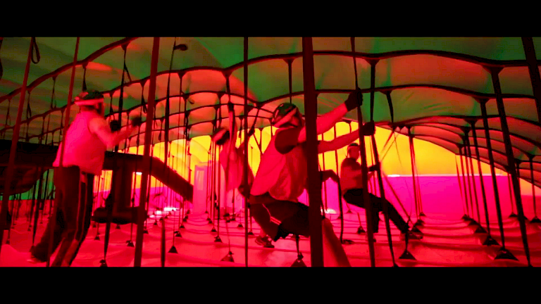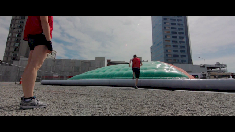 Level Playing Field involved 48 teams of 5 people who responded to an open call for participants who competed for 6 weeks. The creation of the sport was in direct response to the idea of unstable ground. The rules required participants to run over an erratically undulating playing surface in the form of a long mound. Teams took turns running in a relay circuit over the inflatable while the opposing team, hidden inside structure, pulled upon strapping to manipulate the stability of the surface with the goal of unseating those traversing over top. The more circuits each team completed, within the limited time frame, became the victors.