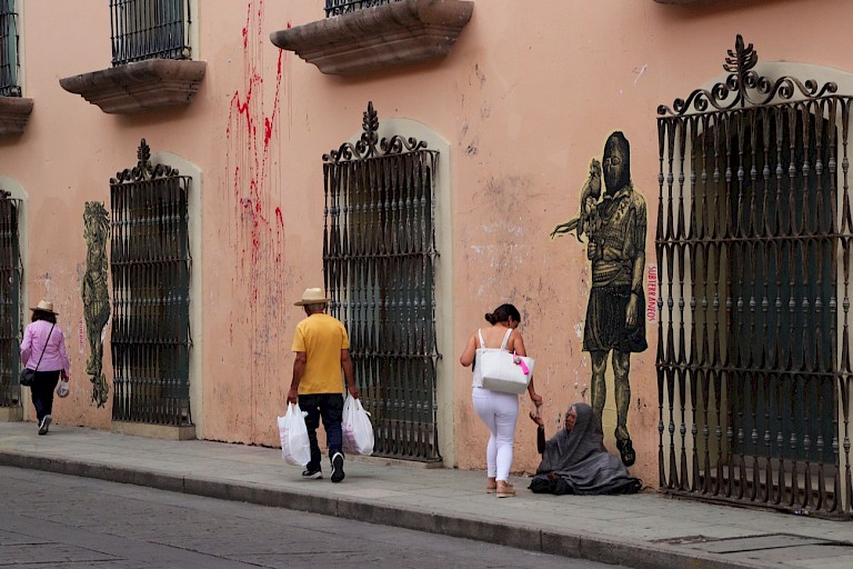 Subterraneo create images that contain figures from the popular Mexican imagination, as well as characters of indigenous affiliation: jaguar warriors, street vendors, individuals wearing traditional and ceremonial headdresses and clothing; historical figures such as Emiliano Zapata or local figures such as Tehuanas and peasants. In this way, the collective appropriates public space to commemorate and pay tribute to characters from popular folklore, and also minority and historically marginalised social groups.