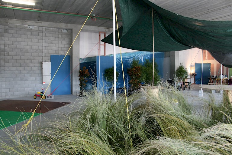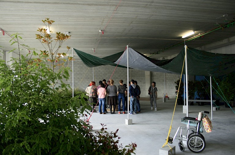 Tāmaki Makaurau Auckland (Aotearoa New Zealand), like Pōneke Wellington and Ōtautahi Christchurch, exhibits a low-density urban settlement pattern. Planning for Aotearoa’s three largest cities began with the grid, with “ample provision for public space like squares and parks.” However, these public spaces were “sacrificed to commercial imperatives” as the early townships developed, with the consequence that Auckland and Wellington “lacked organised public space to foster civic life” (Schrader, 2014). Meanwhile, residential dwellings privileged the “stand-alone house on an individual section and a cultivated garden” (Schrader, 2014), the fenced-in backyard and “bach” (holiday home) accommodating, to a degree, the social life that might elsewhere and otherwise occur in the public realm.Planners in the late 20th and 21st centuries attempted to address the deficit of civic or public life in these cities by providing civic squares and so-called “pocket parks.” Still, providing such facilities does not necessarily mean that prevailing patterns of public life are transformed overnight. It is in this historical context of urban development that the public artwork Park for a Day and the larger project Make Believe, to which it belongs, acquire their significance. Initiated by Kathy Waghorn (of the collective HOOPLA), Make Believe: Imagining a New Park for New Lynn began in 2012 when the artist/architect learned of plans by Auckland Council to establish a new ‘urban park’ in her neighbourhood (New Lynn, West Auckland). In discussions with the Council, it transpired that a park design had already been commissioned, but the result failed to meet the expectations of the Council’s Community Development Arts and Culture (CDAC) team. Make Believe arose out of a proposal by Waghorn to CDAC.“My proposal was that we generate a series of live, public-realm events on the park site that would make it visible, make it known by residents as a space of potential through producing transformative experiences of it and in it, and, in a transient and culturally diverse neighbourhood, create personal and collective experiences of the place, connecting the past with the future.” (Waghorn, 2017, p. 42)Four projects took place as part of Make Believe between 2012-2014, each generating playful and participatory modes of public engagement in the imagination and design of an urban park in the neighbourhood. Park for a Day was one of these projects, resulting from an invitation to the Suburban Floral Association (a collaboration between artists Monique Redmond and Tanya Eccleston) to develop a work. Waghorn became aware of the Chinese Eco Elders, an already-established neighbourhood group comprising elderly new migrants from China. This group had appropriated a rubble-filled space at the end of a car park left over from nearby development in New Lynn, close to the site for a planned new urban park and transformed this into their own small community garden.Acknowledging their existing interest in botanical spaces and informed by a series of translated conversations, in Park for a Day, SFA worked with the Chinese Eco Elders to develop a day-long installation, a “temporary landscape” inside a vacant shopping development in New Lynn on the 3rd of May, 2014.“Fabricated from stretched tarpaulins, rope, huge cable reels, concrete blocks, timber planks, many potted plants, pieces of furniture and large-scale photographic prints, this Park for a Day responded to a series of conversations with the Elders. The ‘park’ installation was an abstraction, a ‘not-to-scale’ test of possibility where provisional materials were used to make spaces and shelters in which to eat, move, exercise, relax, gather and converse.” (Waghorn, 2017, p. 62).Hosted by SFA and Waghorn and attended by the Chinese Eco Elders and their extended families and friends, interpreters, CDAC staff and volunteers, the event within the installation took the form of convivial conversations around the cooking and sharing of food. SFA describes the makeshift “landscape” created within the vacant building as a “propositional space”, but the project might also be characterised as a form of social sculpture. Instead of ‘consulting’ via pre-formed, language-based methods, CDAC staff were able to join the Chinese Eco Elders in this carefully crafted temporal ‘park’ and together imagine and perform possibilities for the future urban park.