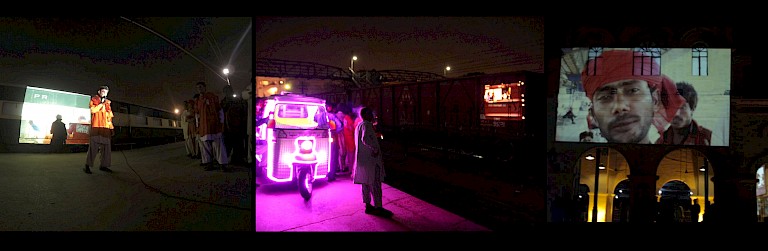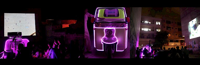 Upon her return from studying in the US, Chaudhri was particularly concerned with the increasing privatization and class segregation in Karachi. To break this seegregation, which can also be found in art galleries - spaces that cater to elite classes, and architectures that divide Karachi by class, ethnicity and gender. To counter this, Chaudhri and her team - the 'Tentative Collective' - created a program that would depend wholly on local interest and interactions. The project was variously funded through crowdfunding, and through the 'Artspire' program of the New York Foundation for the Arts, and additionally funded by the United States Institute of Peace, National University Singapore, and materially supported by local outfits and individuals such as Sazgar Rickshaws, Raja Sabri and Shafayat Bhai who constructed the MKMC rickshaw projection unit.