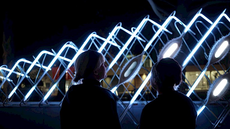 Constructed out of an intricate weave of steel and acrylic tubing, digital displays and electronics, the Murmur Wall allows visitors to witness streams of data weaving through the wall in the form of animated LED light and digital text displays. One may also contribute their “whispers” online [www.murmurwall.net], allowing momentary words to be immediately interjected onto the wall. These real-time anonymous contributions are akin to tagging the city with urban graffiti. The whispers move rapidly through the lattice as bright white datastreams; they appear only once and are not collected, reused or shared.