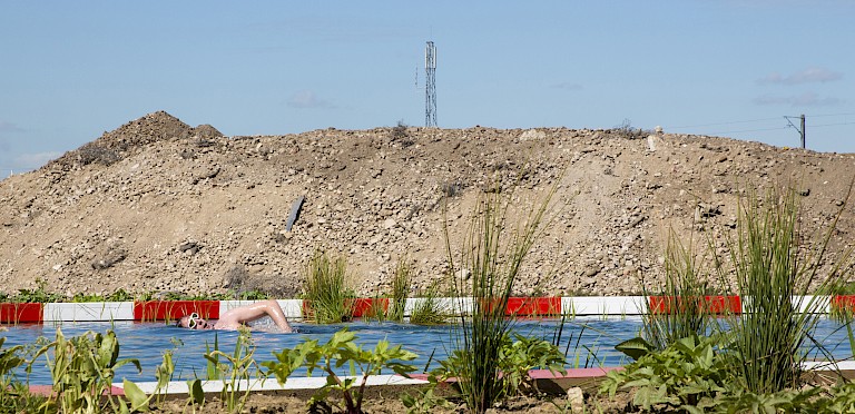 For Of Soil and Water Marjetica Potrc together with OOZE architects built a micro ecological environment with a natural swimming pont in its centre, a 40 metre long pond on King’s Cross, a busy area in the metropolitan city of London, which gave space to over 100 bathers at the same time. People swim in the midst of a lively construction sites with cranes and trucs in a pont of water that is entirely chemical free. The water is purified by natural processes using plants, nutrient mineralisation and a set of filters to supplement natural filtration. Once cleaned the water loops back in the pond to complete the water cycle. The daily number of bathers is restricted by the amount of water the system is able to clean. The use of the pond range from an area of meagre soil and pioneer plants, to a meadow area of rich soil with lush grass and wild flowers. As they grow, the plants clean and enrich the soil of this urban construction site. The enclosed site presents the natural environment in miniature, a landscape in motion, a theatre of ecological cycles: the water cycle, plant cycle and soil cycle. It is a mise en scene of the processes that occur between humans, water, soil and plants. Here the joy of swimming combines with awareness of our responsibility towards the environment. The elevated pond becomes a stage where the swimmers perform the balancing act of co-existing with nature in the heart of a metropolitan city, learning to understand human boundaries, the regenerative power of nature and pointing to new visions of nature-culture relations.