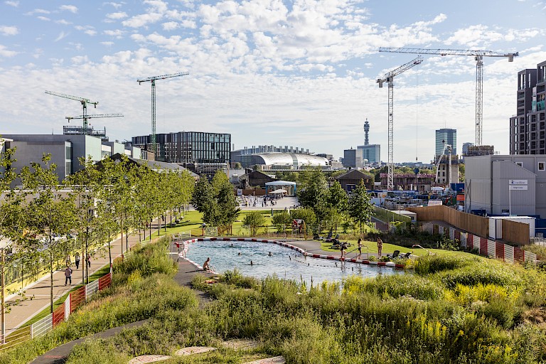 Of Soil and Water: King’s Cross Pond Club is an art installation in the form of a natural bathing pond, at Lewis Cubitt Park in the King’s Cross development site, London and is designed as a collaboration between Berlin based Slovenian artist Marjetica Potrc and Dutch based architects Ooze (Eva Pfannes and Sylvain Hartenberg) (they have worked together on several large scale collaborations). Potrč's interdisciplinary practice includes on-site projects, research, and architectural case studies. Her work documents and interprets contemporary architectural practices in particular with regard to energy infrastructure and water use and the ways people live together. Her work has developed at the intersection of visual art, architecture, and social science.