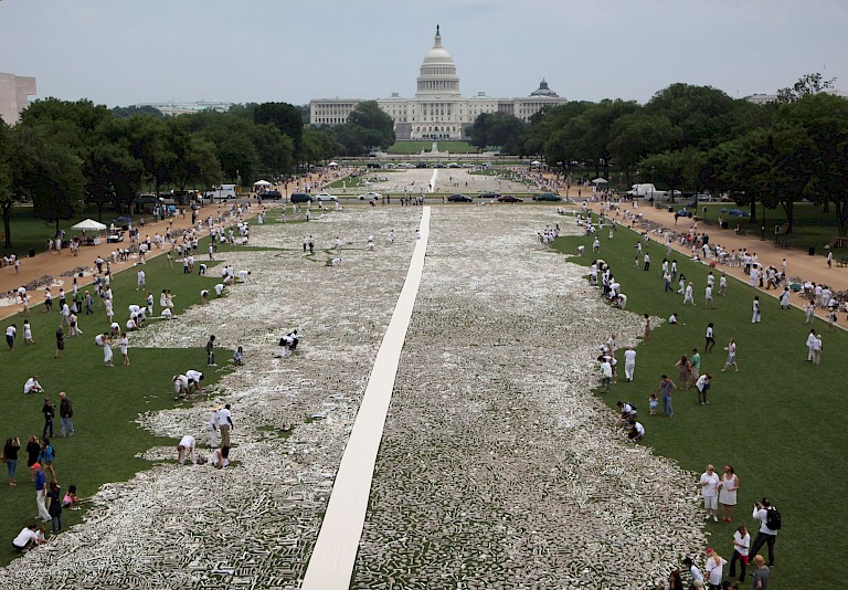 Created by artist Naomi Natale, the project is a large-scale social art work combining education, hands-on art-making, and public installation to raise awareness of ongoing genocides and atrocities in places like Sudan, South Sudan, the Democratic Republic of the Congo, Somalia and Burma. The project involves students, activists, artists and educators from all over the world, as a form of collective call for awareness and action. More 1,000,000 handcrafted bones were collected over a period of 3 years, for a three-day installation event on the National Mall in Washington, D.C., in 2013. The installation existed as a collaborative site of conscience to honor victims and survivors, and will also serve as a visual petition against ongoing conflicts and a resounding call for much need and long overdue action. The project was developed with a series of programming and parallel activities: speaker series, performances, educational workshop and created an open platform for remembrance and spirituality.
