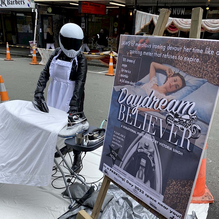 Besides the main aim of temporarily reclaiming spaces from cars for public life, WST’s iterations of Park(ing) Day also focus on connecting artists and other creative practitioners with Wellington’s residents, potentially as a form of professional development for many participants. This is evident in some of the participant feedback on the 2023 iteration: