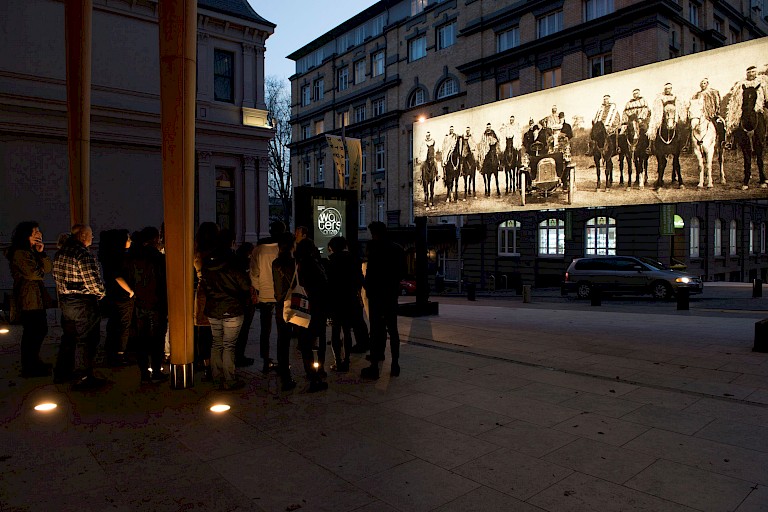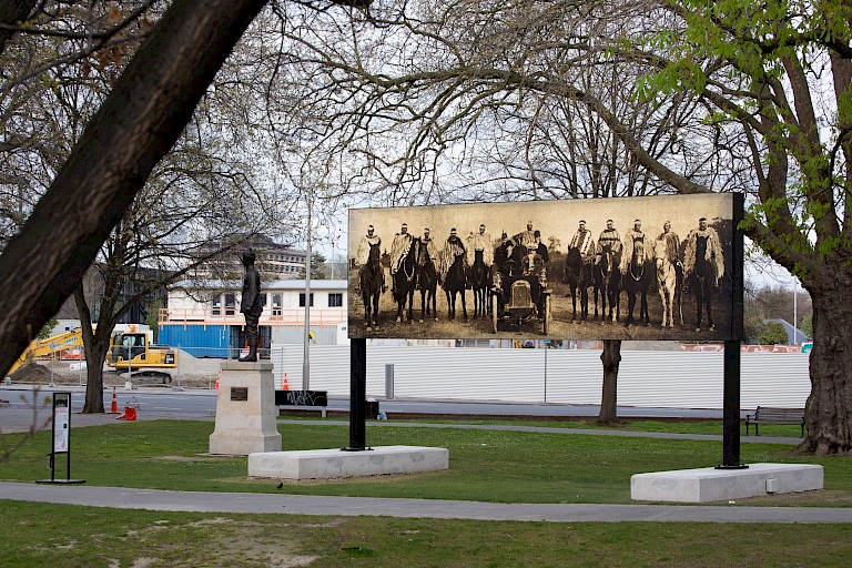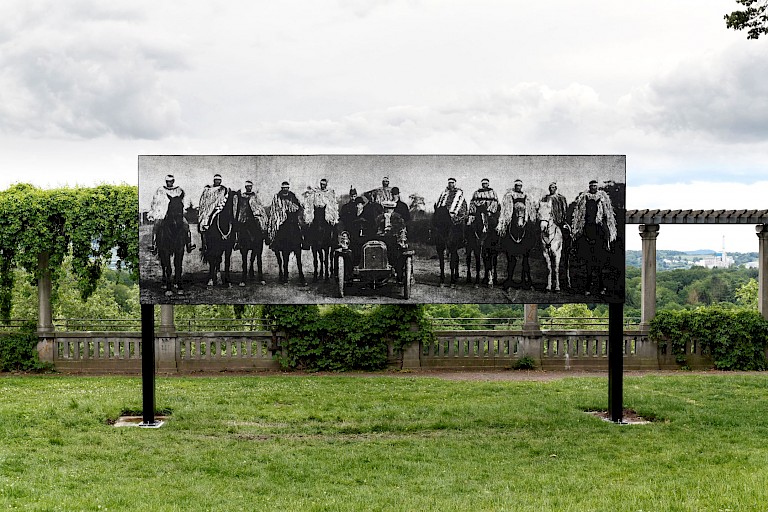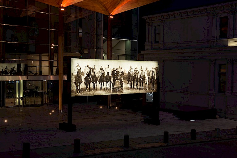 Nathan Pohio presented Raise the anchor, unfurl the sails, set course to the centre of an ever setting sun! on a monumental scale as an illuminated free-standing billboard. The art work reproduces a striking image - a photograph by C.J. Jennings documenting a historical event in 1905 which saw indigenous leaders meet representatives of the British crown. Ngāi Tahu leaders - ancestors of the artist - magnificently attired in full ceremonial dress and on horseback, flank the Governor of New Zealand, Lord Plunket, his wife, Lady Plunket, and others in their motor car. They are on their way to the Tuahiwi Pā (Māori village or defensive settlement) at Kaiapoi to bring the Ngāi Tahu land claim to vice-regal attention. On discovering the photograph Pohio was struck by the undeniable mana_ of the Ngāi Tahu leaders, and by how the image speaks of the Māori manaakitanga, or hospitality. Although Ngāi Tahu were in court with the Crown over land grievances at the time, Ngāi Tahu dignitaries had ridden out to welcome Lord and Lady Plunket who were manuhiri (visitors) to their lands and escort them to the marae (meeting grounds and focal point of the community), rather than waiting for them to arrive. To those in the car - the representatives of the Crown, and therefore of Empire and the vicious battle over Māori lands the English had in many cases had taken by force - Ngāi Tahu display their mana and uphold their cultural traditions including manaakitanga - the duty to host- to the people in the car. But there’s more at stake than just good manners or correct etiquette, there’s land at stake. As Louise Garret writes of the art work “Importantly, for Māori, the relationship between the land, the natural resources it sustains, and the people is not only symbiotic but familial: the land is regarded as a divine ancestor, a conviction that was recently recognised in settlements in which a river and a mountain in the North Island of New Zealand were granted legal status as human beings.” What followed this photograph was an opportunity for Ngāi Tahu to bring their land claim to the attention of the Crown. This is a historic moment, and a debate which is still defining New Zealand politics.