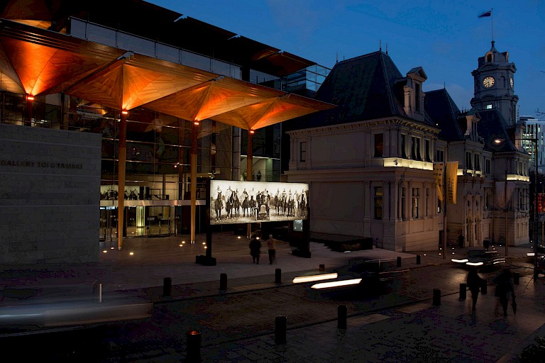 To re-site the work in Auckland it was essential for Pohio to find connection to the site. As Ngāi Tahu, Pohio felt a deep responsibility for his kaitiakitanga (guardianship) of the image, and the issue of how to bring his ancestors to Auckland - into someone else’s land - was problematic. The artist reconciled this with the notion that the men from Kaiapoi could tautoko (support) a Gottfried Lindauer portrait of another Kaiapoi chief in Auckland Art Gallery’s collection. For Pohio it was deeply significant that “these representations of men of mana and our rangatira (leaders) all of Kaiapoi are gathered for a time, to share the same site and be present together for the first time”. Standing at the entrance, Raise the anchor… formed a portal of sorts under which visitors to the gallery entered. As a gateway, again the artwork embodied the values and undercurrents present in the art work - as a ritual of inauguration, of welcoming, of transition from one place to another.