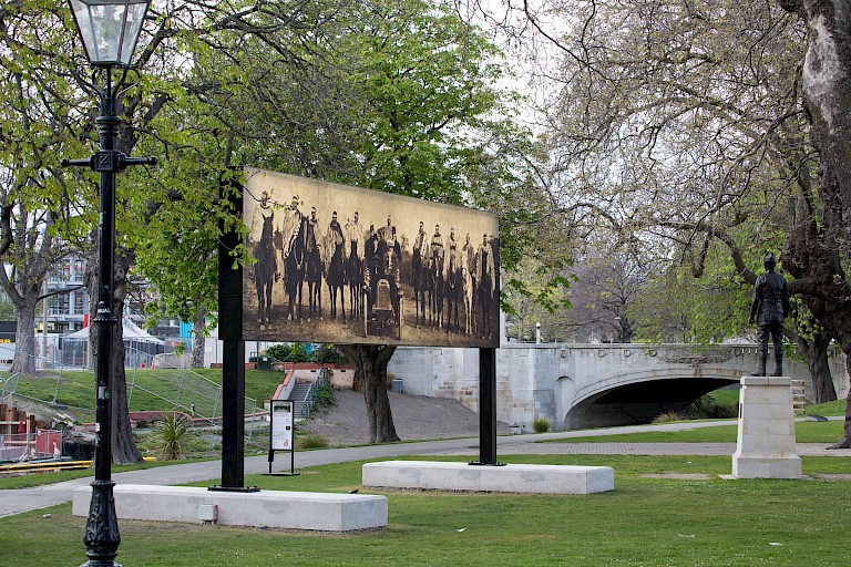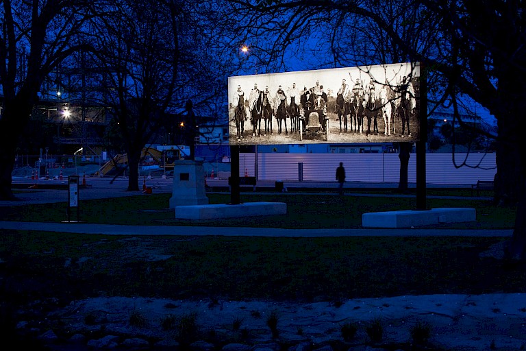 Raise the anchor, unfurl the sails, set course to the centre of an ever setting sun! was one of four finalists for the Walters Prize 2016, New Zealand’s premier art prize, and described in the jury statement as “one of the most resonant and sharp works to come out of the highlycharged political and cultural situation of the Christchurch rebuild, following the devastating earthquakes in 2010 and 2011.” A quiet and powerful conceptual intervention that reasserts the cultural landscape of Otautahi-Christchurch, Raise the anchor… is infused with the drawling grandeur of popular western film history. The photograph has been cropped so it’s the same format as the early 20th century cinematic screen, and its similarity to the poster for the iconic western, The Magnificent Seven, is clear, even though it predates it by more than five decades. There’s the familiar sense of thrill and adventure that the Western promises, but also perhaps a chance of that other favourite cinematic trope - the ‘a do-over’. Raise the anchor….. speaks to untold or forgotten stories of Christchurch's history, making these stories monumentally visible in a city that, before the earthquakes, delighted in its colonial past and reputation as the most English of cities outside England. At a time when so much of the city is being rebuilt and new identities established, the work confronts and contests the histories that are embedded in the land and offers new hope for a city that more correctly represents its people and cultural pasts.