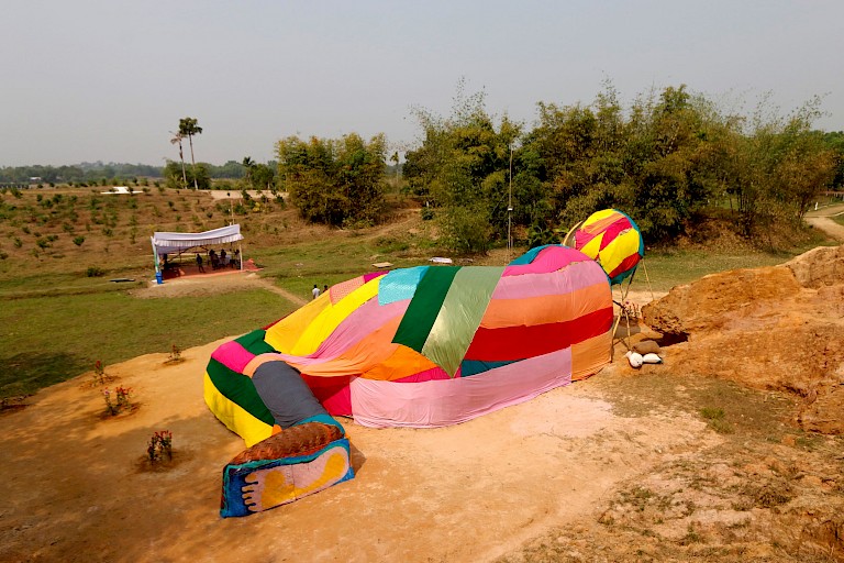 Rokeya is a monumental interactive sculpture created by Polish artist Pawel Althamer and ‘The Neighbours’ – members of his community back in Poland – at Bangladesh’s newly opened sculpture park – the Samdani Sculpture Park in Sylhet. Rokeya is a reclining woman – large enough for people to walk through and work inside - made of bright textiles stretched over a bamboo frame – built by Althamer, The Neighbours and 100 villagers and children from the area, along with patients of the Protisruti Drug Rehabilitation nearby. The sculpture houses a kiln and a community space for interactions with locals as well as workshops, exhibitions and other community activities. Since it’s completion in March 2017, the sculpture has engaged large numbers of local school children and community members and continues to remain a collective space for art and public engagement.