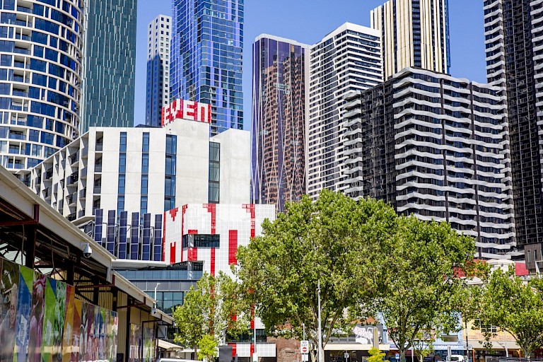 The work was initiated by the City of Melbourne in early 2019 on a very short turnaround of 4 months for final detailed design. The work is permanent and produced during Melbourne’s extensive lockdown. City of Melbourne approached the conceptualisation of the brief initially from a practical stand point given the short timeframe and the necessary requirement to work with the already planned screening. If there had been a more radical proposal made commissioners say they would have tried to seek additional funding, but practically speaking the timeline and creating this art work under a Covid situation was unlikely to make that a viable option if they were to stay on track with construction timelines. Process and artist selection was shaped by these practical considerations, with only 4 months to conceptualise an artwork and take it through detailed design with the architects. The Queen Victoria Market (QVM) renewal development team approached the City of Melbourne quite late in the construction process with the façade opportunity and in response project lead Jo Mair and architects approached three artists who could respond creatively to the material requirements of the façade. Primarily aspects an artist could easily influence were the flat surface of the screens through an applied design (paint, etc) and the perforations (shape and distribution of perforations) but maintaining the required % of shading needed to meeting planning conditions. The three artists were invited to meet with the QVM renewal team (the architects and Mair) to discuss the opportunity. They were asked to simply respond to two questions 1: What do you find compelling about the opportunity and 2: Proposed approach and methodology. It was very evident from those three meetings (conducted over three separate days) that Rose Nolan had a clear and compelling connection to both the market and the opportunity and that her process and methodology were well aligned to achieve an exceptional outcome working closely with the architects, who were thrilled to be working with her. Nolan brought significant respect/ power, personality and collegiality to a compact time frame that could easily have become more complex if the wider team wasn’t aligned in thought and direction.The cost of Nolan’s façade artwork was largely cost-neutral as there was already an expectation of a perforated screen element for the building. A change to two colours required for Nolan’s artwork was an approx. AUD$30,000 increase in budget, and Nolan was paid a design-only fee of AUD$30,000.