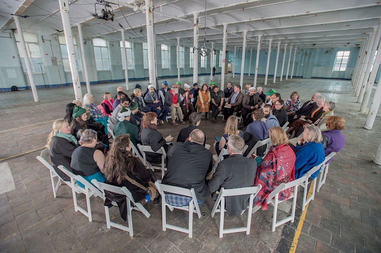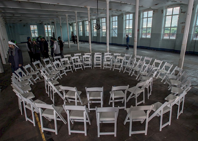 The art work was a response by Lacy to bridge history, culture, and identity through re-building community relationships and restarting conversations about public commons. Lacy and her collaborators worked closely with the community in a series of monthly meetings and singing sessions, exploring the history of the former mill, area, and local vocal traditions.[3]_ Shapes of Water - Sounds of Hope took inspiration from Shape Note singing and Sufi chanting, both centuries old traditions of civic and religious expression. Shape Note has strong roots in Lancashire, while the Middle Eastern Sufi tradition is commonly practiced by Pendle’s Muslim community. “I have wanted to work with shape-note music for about 15 years” Lacy commented. “…It is class-reflective, it’s embodied, it’s highly participatory, its structure is democratic, and it’s quite visceral.” An open call for participants across the multicultural community created a group to learn Shape Note and Sufi singing together over a two year period. Music is one of the most powerful conveners of unity and collective emotion, however its ability to unite can often supplant dialogue and gloss over important issues. To counter this a regular format to the meetings was established - learn to sing together, then eat together, and talk together about critical local issues. The result was a new artwork, culminating in the three-day event at the mill.[4] To document the journey and culmination of the art work, Lacy and her collaborators produced a film featuring local residents, interviews with former mill workers and their families, and performances of Shape Note and Sufi chanting during the three-day event.[5]_ One year later in September 2017 the community were again welcomed back to the mill, a symbolic remnant that defined Pendle’s landscape and the lives of its people.