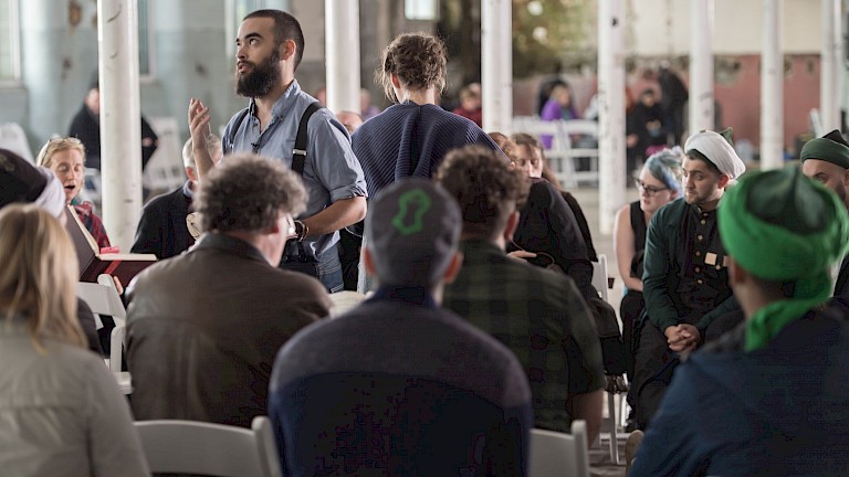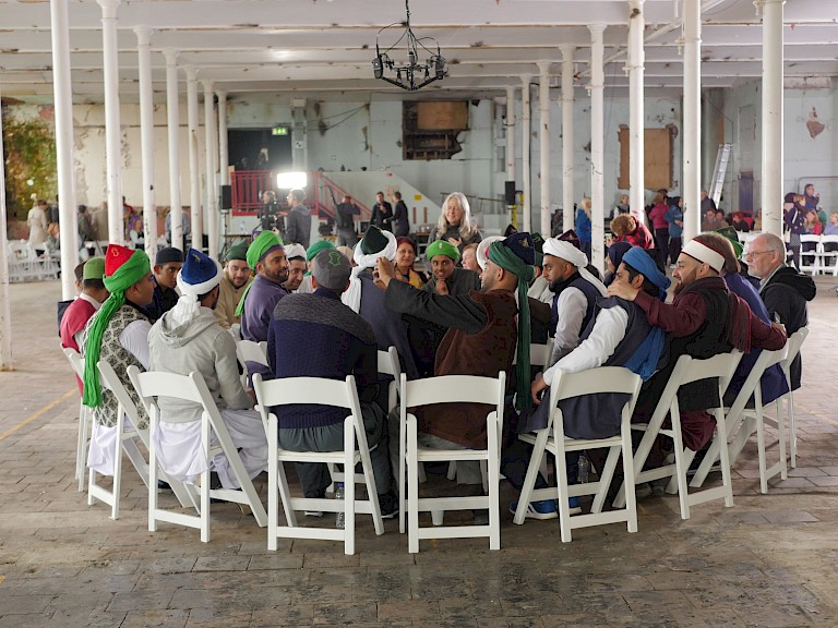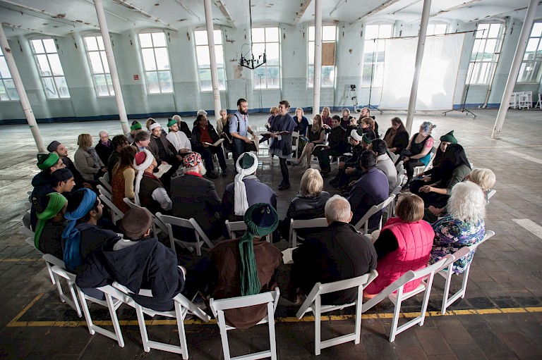 The community meetings which shaped Shapes of Water - Sounds of Hope provided a safe place to connect and have critical conversations across a growing cultural divide. However, beyond the re-establishment of dialogue, cooperation, and shared space, the project allowed something more to be generated, something less tangible but exceptionally powerful. In working with vocal traditions that facilitate congregational singing, Suzanne Lacy captured non-verbal ways of creating cohesion. Participants in Shape Note are seated in a square around which the four vocal parts - treble, counter, lead and bass - sing with one another and to one another, rather than facing outwards to an audience. Similarly, Sufi chant is sung in an inward facing concentric circle, with the intention to let human diversity be subsumed in unity and concord. Yet still, beyond these physical formats, the role of voice and music to connect people is key to Shapes of Water - Sounds of Hope.