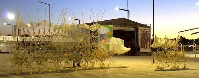 Each of Jansen’s beasts takes approximately a year to create, and each new strandbeest improves on the previous version, with the artist implementing modifications in response to the difficulties encountered (e.g. withstanding storms)—a kind of assisted evolution. One iteration of Jansen’s strandbeest projects consisted of the installation of two creatures from a growing bestiary at Tecnopolis 2012, the largest art/science/technology event in Latin America. The two animals were Animaris Umerus and Animaris Ordis Mutantis, the former, a gigantic 12-meter in length and 4-meter in height, and the latter, closer to human scale.