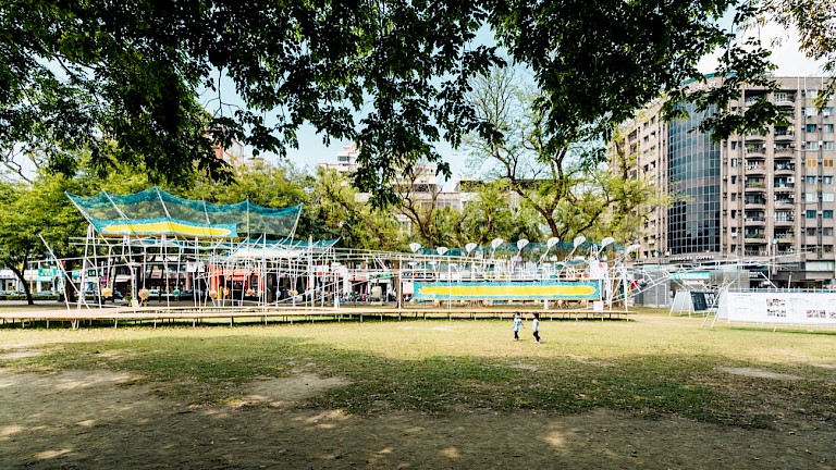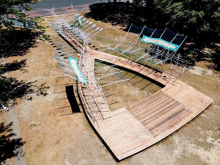The primary form and structure of the artwork were completed by the "Group B" creative team from Tainan University of the Arts. "Group B" is the Institute of Architectural Arts at Tainan University of the Arts, currently composed of students led by Professor Zheng Chengqi from the "Field, Structure, Action Group." Continuing the renowned spirit of the "Architecture Breeding Ground" from the university, they explore materials and interpret how to intervene in space through the work's form and structure, forming a new organic relationship between humans and the environment. In such creation, change and uncertainty are emphasized, presented through the hermeneutic aesthetic concept of "play (spiel)." This "play" is an interaction between the creator and the work, the work and its environment, and of course, with the viewer. As it's a "game," it's played by the creators. Unlike many public artworks designed by artists and then manufactured by factories, Group B's works are personally completed by the university's faculty and students, combining precise architectural design with a handcrafted roughness.
