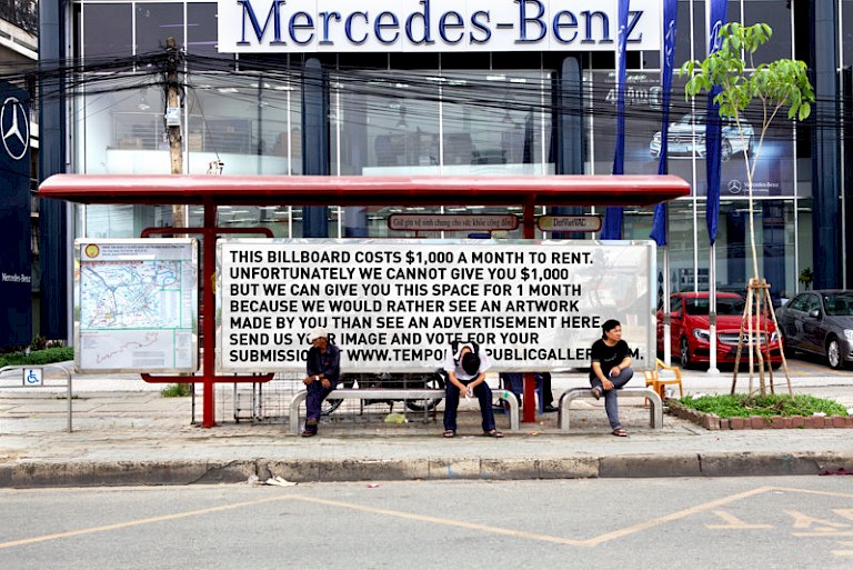 There is an eclecticism and spontaneity to the practice of The Propeller Group, the antithesis of Vietnam’s ordered socialist state. In their role of challenging and provoking the status quo, the collective and the Temporary Public Gallery project exist as a catalyst for a creeping but powerful social change—not only in the visual landscape, but also in how the people use and respond to their city. Funded by a grant from Art Matters, the New York based organisation created to assist artists breaking ground aesthetically and socially, the project hit censorship hurdles and was never realised in its full form.