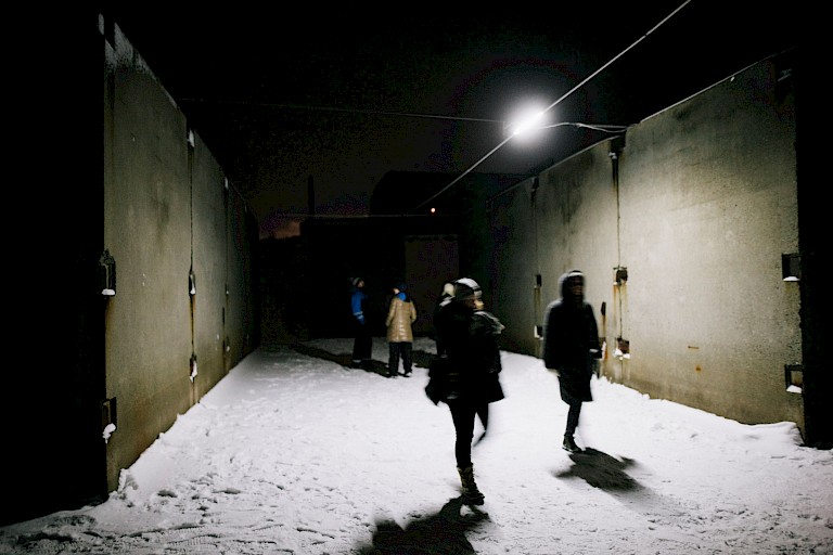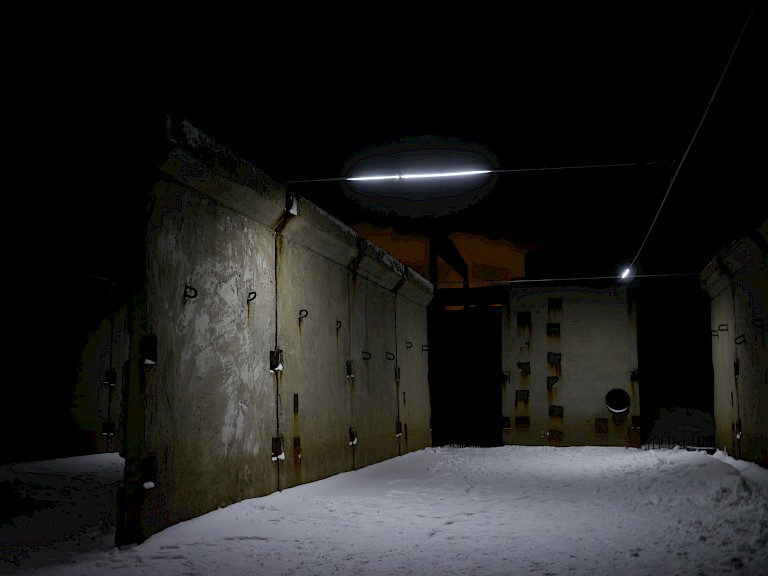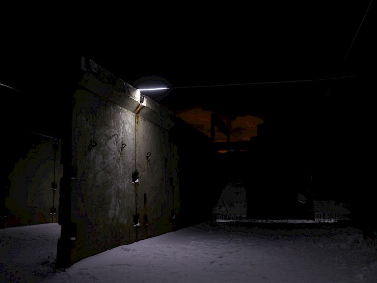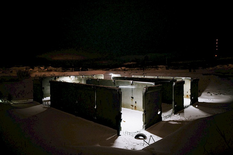 HC Gilje described his own project as being partly inspired by a quote from the essay "Motor Geometry" by the Dutch architect Lars Spuybroek: "We no longer look at objects, whether static or moving, but at movement as it passes through the object." The Crossing acted as a subtle interference that caused a shift in the perception of the site, and linked it to a broader and deeper realm of the Northern environment. It also merged the line between the work and the viewer, as audience could enter the construction site and move around it, following and traversing the moving light network. Zapolyarny is a community that and metallurgy. Located 103 km to the north-west from Murmansk, the administrative centre of Murmansk oblast and the last city to be founded in the Russian Empire in 1919, Zapolyarny is also very close to the Norwegian border. Its residents often travel to Kirkenes (only 65 km away from it) and are allowed to get long-term Norwegian visas. Murmansk region features a subarctic climate mildened by the Barents Sea, with long cold winters and short cool summers, the polar night and the polar day. It is important to understand that with his artwork HC Gilje did not intend to address or analyze the particular local context of Zapolyarny, but rather reached for the contact with the realm of natural frequencies and forces, drawing a connecting line through human-made surfaces and slow, long-lasting movements of the Earth magnitude, as well as infinitesimal, all-permeating, and barely tangible movements of traveling energies in the electromagnetic spectrum. The work did not seek to engage with the community directly, but it was, however, making a meaningful use of a very specific site in Zapolyarny that reflected the industrial origins of the town, the nondurability of industrial projects, and the traces they left that kept slowly integrating into the natural environment.