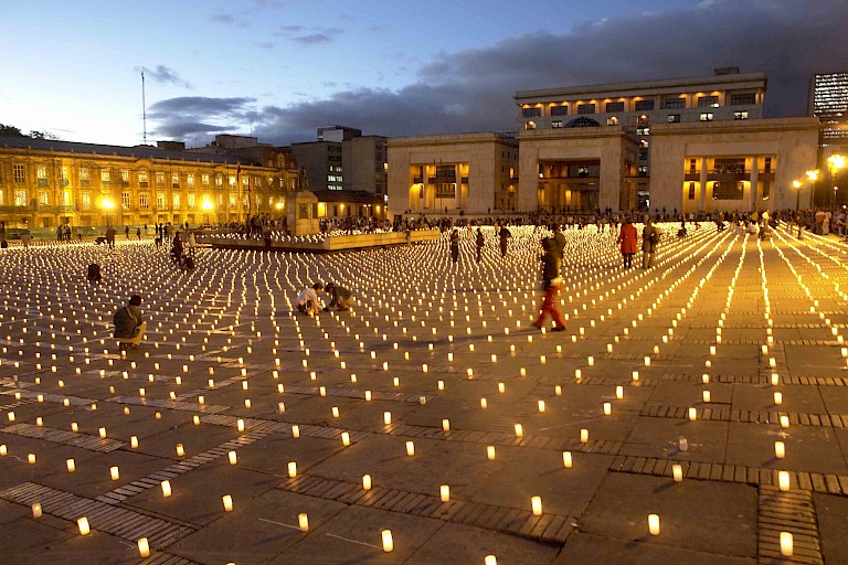 The act of filling Plaza de Bolívar with candles silently honored Colombia, a country that constantly mourns—oftentimes grieving death without bodies. “If you want to dignify a human life then you have to come back to beauty,” Doris says, “That’s where we find dignity and almost turn [it] into a sacred space.” Plaza de Bolívar is flanked on three sides by historic government buildings rising high above the square where politicians make high level decisions. The candles, small and quiet, reminded them of the work they have failed to do.