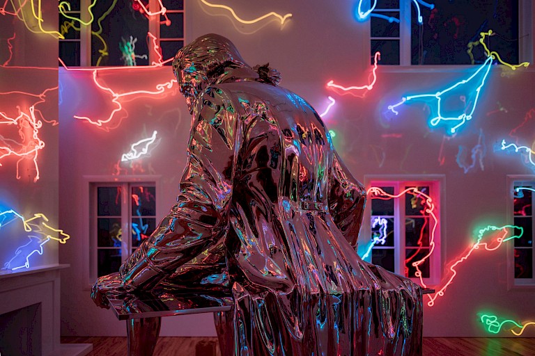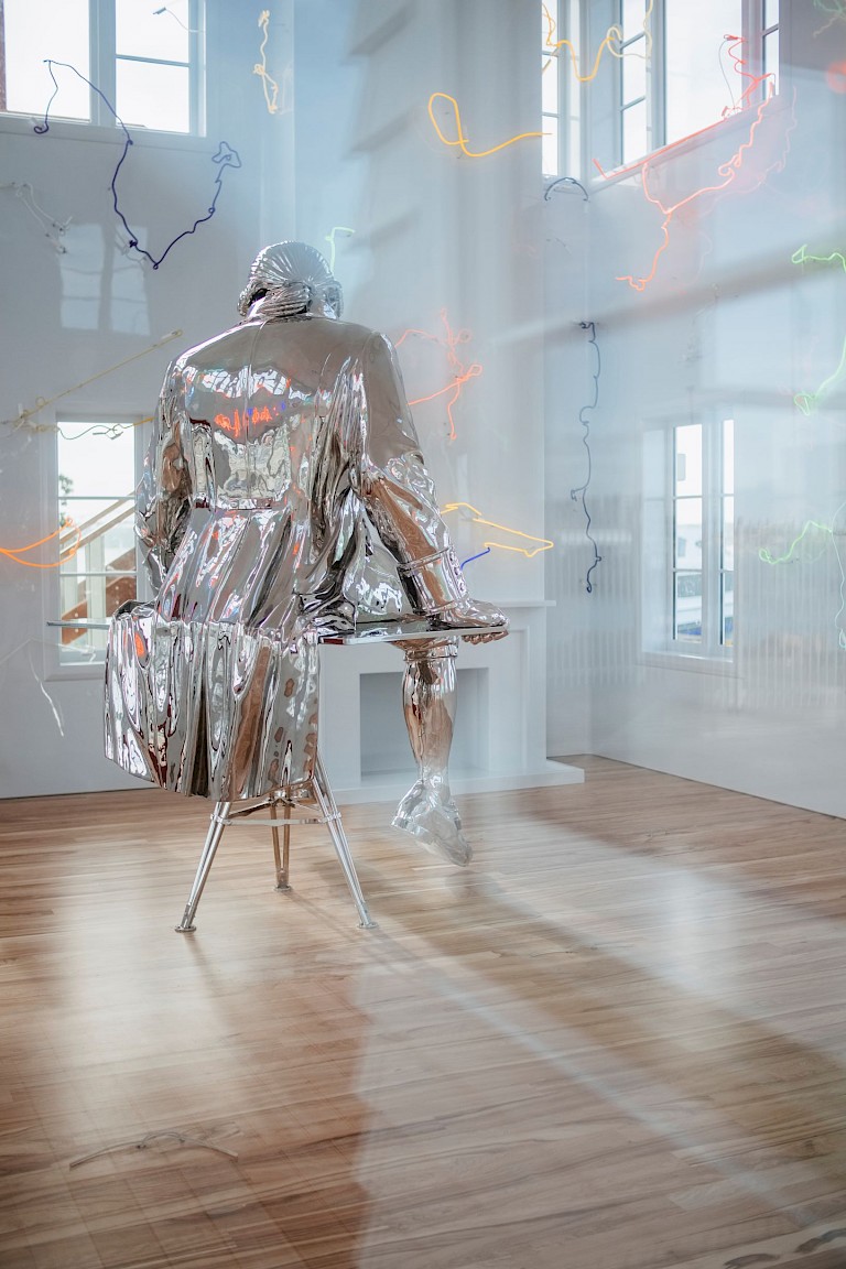Trapped inside the structure, or perhaps protected by it, what role does Captain Cook play? His image is instantly recognisable to local audiences thanks to a living legacy that sees Cook memorialised in place names, paintings and monuments. In contrast to the conventionally heroic, neo-classical portrayal, Parekowhai presents him perched atop a trestle table, feet not quite touching the floor, eyes downcast. The highly polished surface seems at odds with Cook’s body language and peering through a window the viewer has the impression of witnessing an intimate moment. Cook’s posture is contemplative, possibly even dejected. It is a provocation, of course, that device often employed within Parekowhai’s practice. While Cook is a celebrated explorer and key figure in the history of Aotearoa-New Zealand, a timelier more nuanced view inclusive of the controversial aspects of his legacy and of colonialism offers a cultural shift. Intriguingly, the sculpture of Captain Cook was first exhibited inside another art work titled Memory Palace (2015). Cook — as both an agent of Empire and of early interaction between the British Crown and Māori — acts as a memory prod to its audience, a memory prod to places where history continues in the actions and consciousness of people in the present.