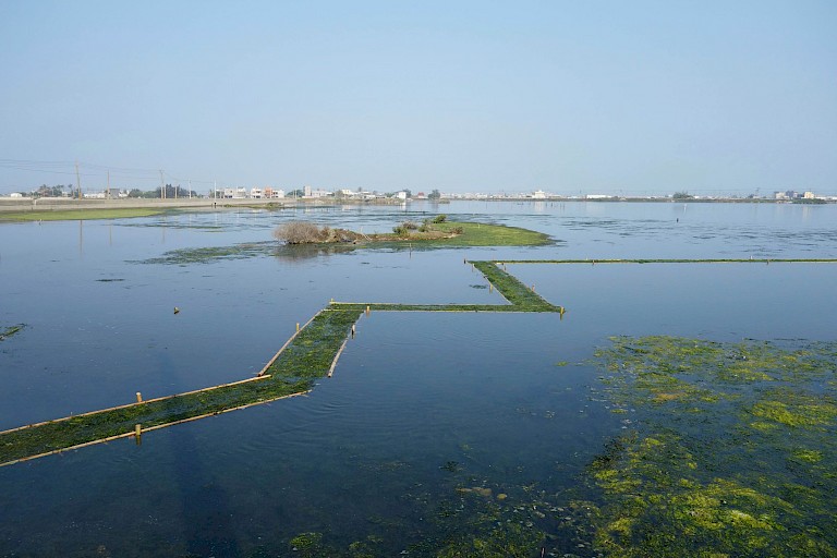 The history of the environment where the exhibition took place and the climatic factors were more extreme than expected. The artist stayed in one of Taiwan's poorest fishing villages. The Chenglong Wetlands originated after 1987 when, after a violent typhoon, a large part of Taiwan's west coast flooded; not only did many people pass away, but also the original agricultural area with trees flooded by the sea water. As a consequence, agricultural land was no longer useful as such and fish farms were built. These massive concrete farms dominate the coastal area and caused that almost all of the original vegetation (plants and trees) have disappeared. Ground water is used to provide these fish farms with freshwater. This causes a substantial reduction of the soil in relation to the seawater level. Fortunately, some farms have recently started using seawater to prevent further ecological problems.