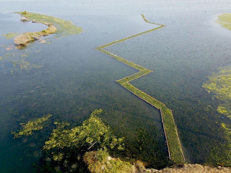 As a location for the The Microclimatic Life-line, the artists chose the area which was struck by the typhoon, where a crematorium with cremated remains of deceased victims which were buried in this area can be seen on the horizon. 'The Microclimatic Life-line' consists of eleven connected rafts made of bamboo and covered with algae. The rafts are made using traditional techniques using bamboo pen and hole joints; were were trained to usethis technique by a local 'bamboo master'. On frames, strips of split bamboo were knotted with the help of villagers and various school children. The result is a biodegradableart installation that will disolve slowly into the Wetlands. During the opening, visitors received an explanation of the artwork and were invited to join the 'Algae Experience'.