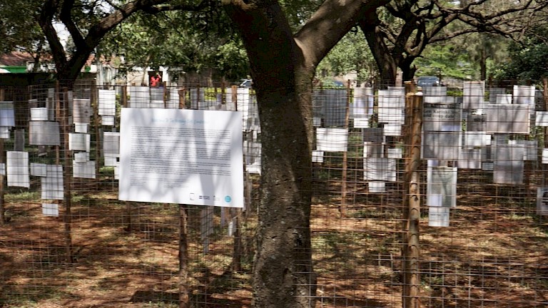 The exhibition was set up in the form of a minimalist temporary maze, constructed outdoors in the library’s green lawn. This naturally allowed everyday and ordinary people passing by the streets access to the installation. Visitors to the show could move up and down through the installation. Utilising nature in an interesting manner, the exhibits were covered by tree shade making it possible for visitors to relax in an oxygen (released by the trees) filled environment, to take their time to read and view the many materials from the archive which were on display. These articles included advertisements, cartoons and news articles among others, purposely curated to enhance view/audience experience and engagement.