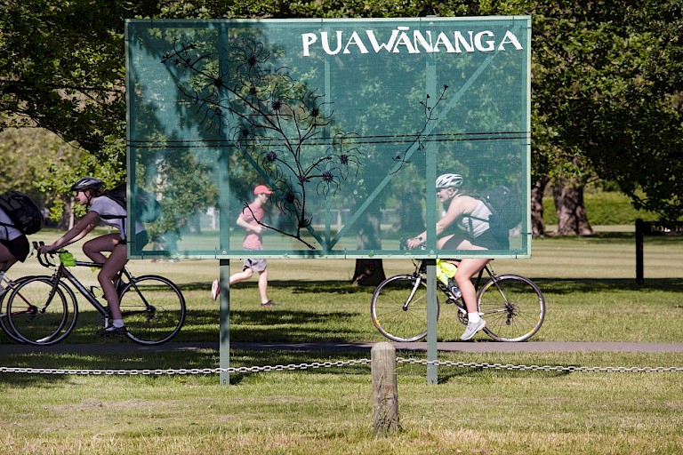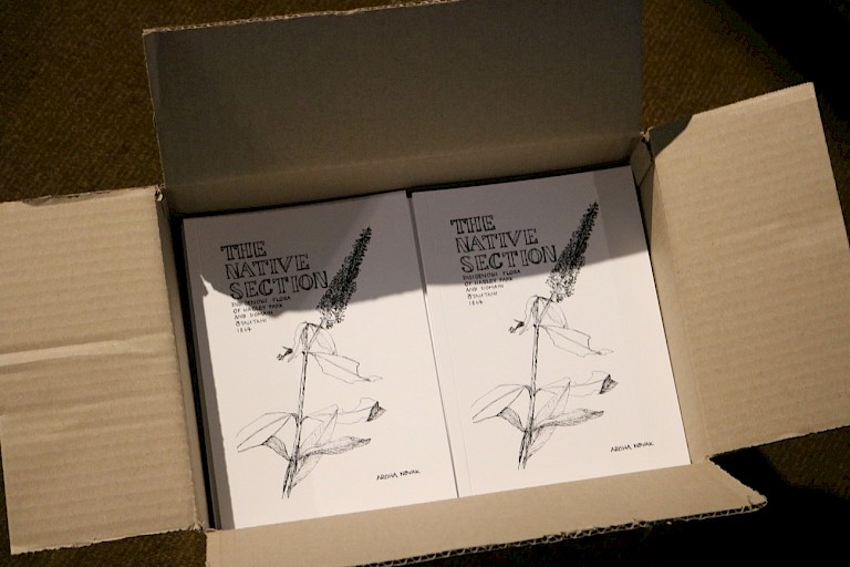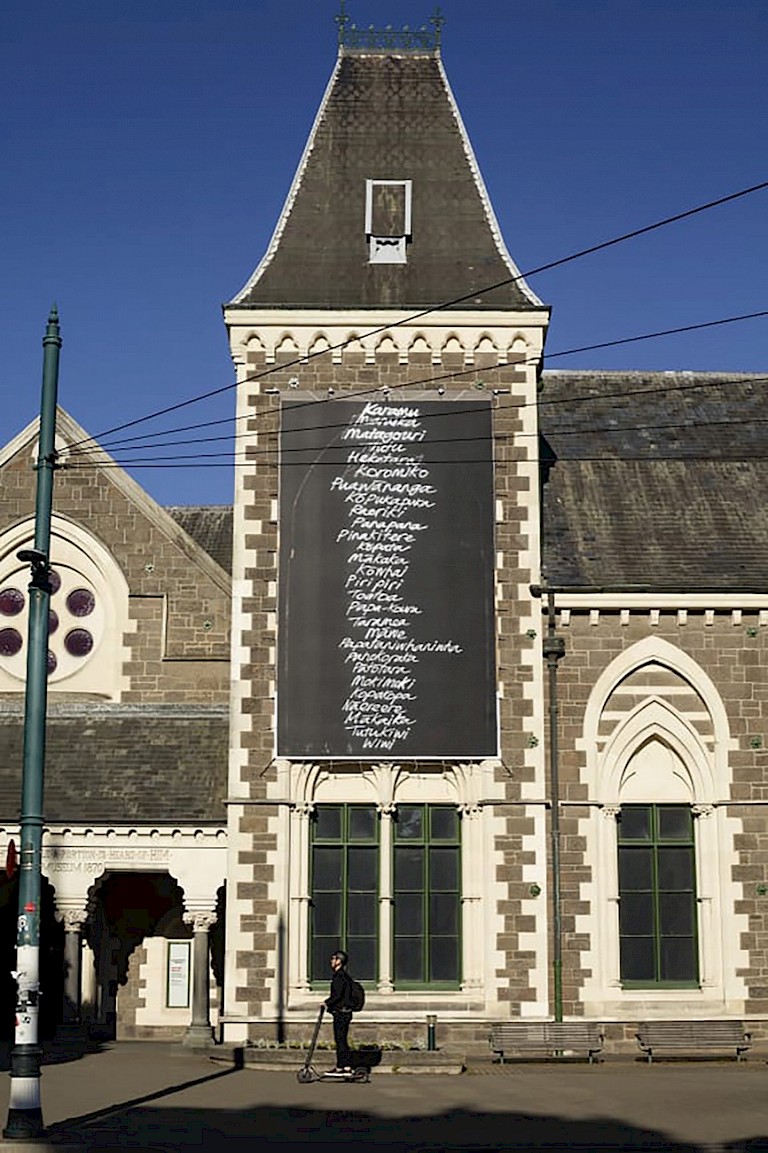 Lead by Managing Curator Jamie Hanton, the SCAPE Public Art event for 2021 approached Aroha Novak to create a project. Hanton had been familiar with Novak’s practice for over a decade. During Hanton’s tenure as Managing Curator at SCAPE there was an ongoing agreement with the Christchurch City Council to activate the billboard frames around North Hagley Park during each season, so thinking about artists whose work could translate to these quite fixed, but ultimately flexible, forms was part of the curatorial decision making. Hanton approached the artist on the basis of knowing an earlier project as well as her interest in urban art interventions and street art. A discussion between artist and curator ensued about this project and what the process might be for working in a similar way on a new, somewhat foreign site. Acknowledging and being sensitive to the stories and knowledge of mana whenua was of primary significance during the commissioning process. SCAPE had a pre-existing relationship with Matapopare, the organisation that represented Ngāi Tūāhuriri during the rebuild of Christchurch following the 2010-11 earthquake sequence, so they were able to rely on their expertise in this process. Novak’s project began large and actually grew further during the commissioning process. SCAPE was able to include an exhibition of the original plant specimens within Canterbury Museum, a publication of her botanical drawings, and a mammoth spray-painted list of all the plants first recorded in pre-colonial North Hagley on the front of the museum. Hanton comments that “These were all additional opportunities that Aroha, to her immense credit, grasped with both hands and executed beautifully.” The overarching theme for Hanton’s three seasons as Managing Curator at SCAPE was Fictions¸ which took storytelling as its fundamental concern. Novak was approached as Hanton wished to work with a range of artists from different backgrounds and disciplines who told great stories and who had the ability to re-present ‘established’ stories that related to sites people may not consider in their daily lives. “In addition to this consideration of site and story” Hanton recounts “I was guided by texture; of the overall materiality of the season. I wanted to ensure that a plurality of material and aesthetic approaches were included in each season that both worked with the environment but could also contradict the established narratives and the way they are told – for example permanent sculptures in robust / precious materials cf. temporal installations featuring more quotidian / DIY making processes”. The commissioning process was approximately nine months long. Hanton approached artists with an informal invitation and an explanation of the season’s theme at the beginning of 2021, the artists who accepted were then brought to Ōtautahi around Easter. During this visit they met the other artists and we spent two days talking about the commissioning process and also familiarising the artists with the city through discussion, walking tours, and a commissioning guide specific to SCAPE. Following this, the artists were asked to supply a proposal of the work they wanted to make. Upon acceptance of this, a detailed design process was entered into. As The Native Section was entirely handmade Aroha continued her research and making. As Aroha was located in Dunedin and travel was limited in 2021, the project team carried out some of the smaller ‘on the ground’ tasks for Aroha including meeting with the relevant institutions and securing the base material (building scrim) for the work.