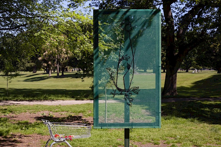 Hagley Park is the city of Ōtautahi–Christchurch’s largest urban open space, a popular and well used park close to schools, Canterbury Museum, and the city centre Christchurch is often described as the most English of New Zealand cities, with its traditional churches, parks, and stone buildings created by early settlers, along with their values, defining much of the city pre the devastating 2011 earthquake. Set into this culture Aroha Novak’s art work takes on a special relevance. The Native Section – situated in a colonial-era park designed along English traditions – alerts its audience to a landscape changed and redefined with references from a dominant culture. A popular park that is part of the city’s consciousness is, in fact, a manufactured landscape and one that sought to obliterate all signs of native flora and traditional uses. Novak suggests her art work “questions institutional frameworks, ways of cataloguing and naming, whilst highlighting Te Ao Māori worldviews where the environment is paramount, looking at the past through a contemporary lens and remembering what was there before.” Her art work is a excellent example of how the subtle interventions of contemporary art can amplify and re-address absence and cultural rupture. The colonisation of Aotearoa affected both land and people, removing or hiding language and practices in a manner that continues to have ongoing repercussions. Intriguingly, Novak’s art work honours both indigenous and European systems of cataloguing and memory while returning language and image to the whenua (land) of Aotearoa–New Zealand. The Native Section continues her interest in recognising and highlighting pre-colonial histories, with the artist’s extensive research focussing on the 88 indigenous and endemic specimens removed from Hagley Park. Taking the two-dimensional forms of the pressed plants held in the collection of Manaaki Whenua — first gathered by J.B and J.F Armstrong at the end of the nineteenth century — and painstakingly translating and transplanting into embroidered images that literally cast shadows onto the whenua they originally occupied. Continuing the skilful use of juxtaposition in this work, Novak has combined the transparency of the scrim upon which the images are embroidered and the builders materials that form her panels/ billboards. Embroidery is a traditionally feminine art common to the time of colonisation, now employed to make a social political comment and reinstate both plants and the Te Reo Māori (language). Novak explains how there were “many tendrils of research that informed the outcomes of this project and seeing it in situ was a culmination of all of those threads being realised.”