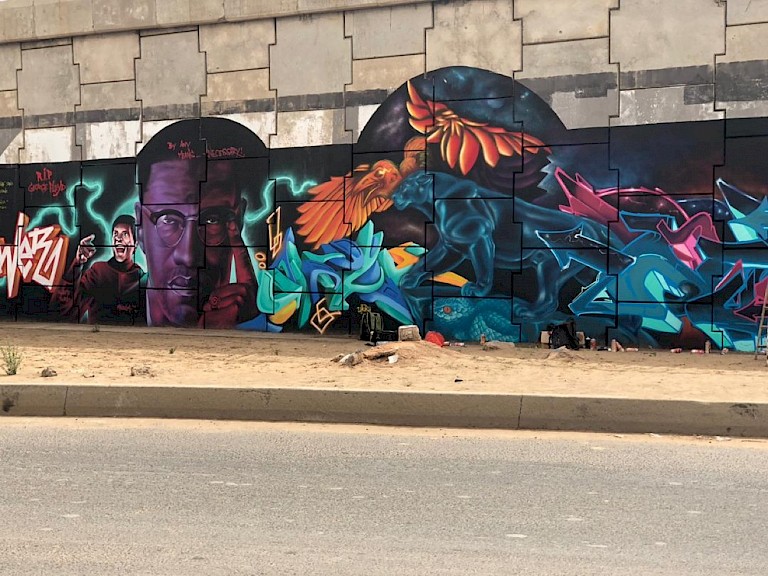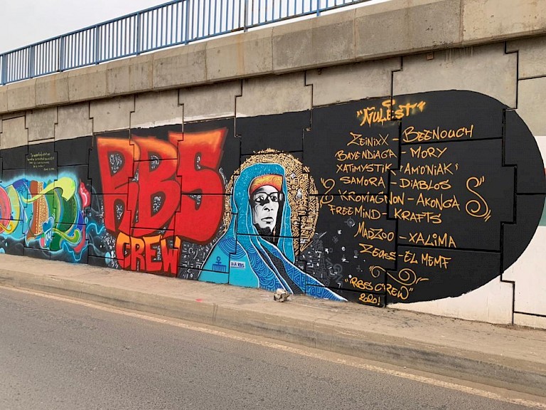 The creative concept and artistic features of the artwork Radi-k-l Bomb Shot (RBS) CREW arose from the work of a graffiti collective who claim to be pan-African. Created in 2012 by MAD ZOO TRK, KING MOW 504 and KRAFTS, this collective now brings together thirty members in Africa, the United States and Europe, and is one of the most active in the world of graffiti in Senegal. For the collective, their Pan-Africanist philosophy must be reflected at all levels in their artistic approach. Apart from their jam sessions and their more spontaneous achievements, since 2014 they also organize traveling festivals throughout the regions of Senegal which also allows to convey their art outside the walls.