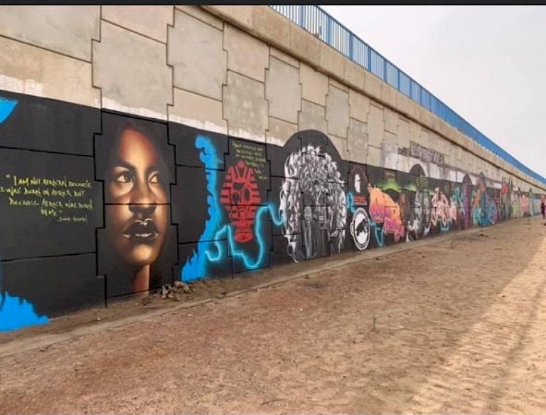 The collective’s frescoes are generally very visible in the city and therefore necessarily appeal to passers-by. The works convey strong messages of self-determination and seek to rupture many paradigms in force within the economic situation on the African continent. The medium assists many to understand the messages of the works in a country where illiteracy exceeds 50%. The Ñullest Wall fulfils this mission of transmitting a philosophy and mindset of self-determination by presenting activists or heroic leading figures who worked for the betterment of the condition of their fellow citizens.