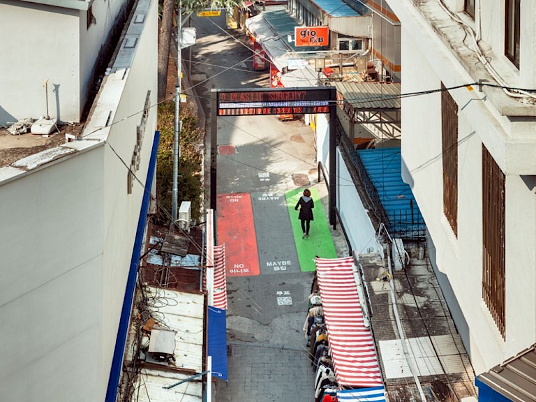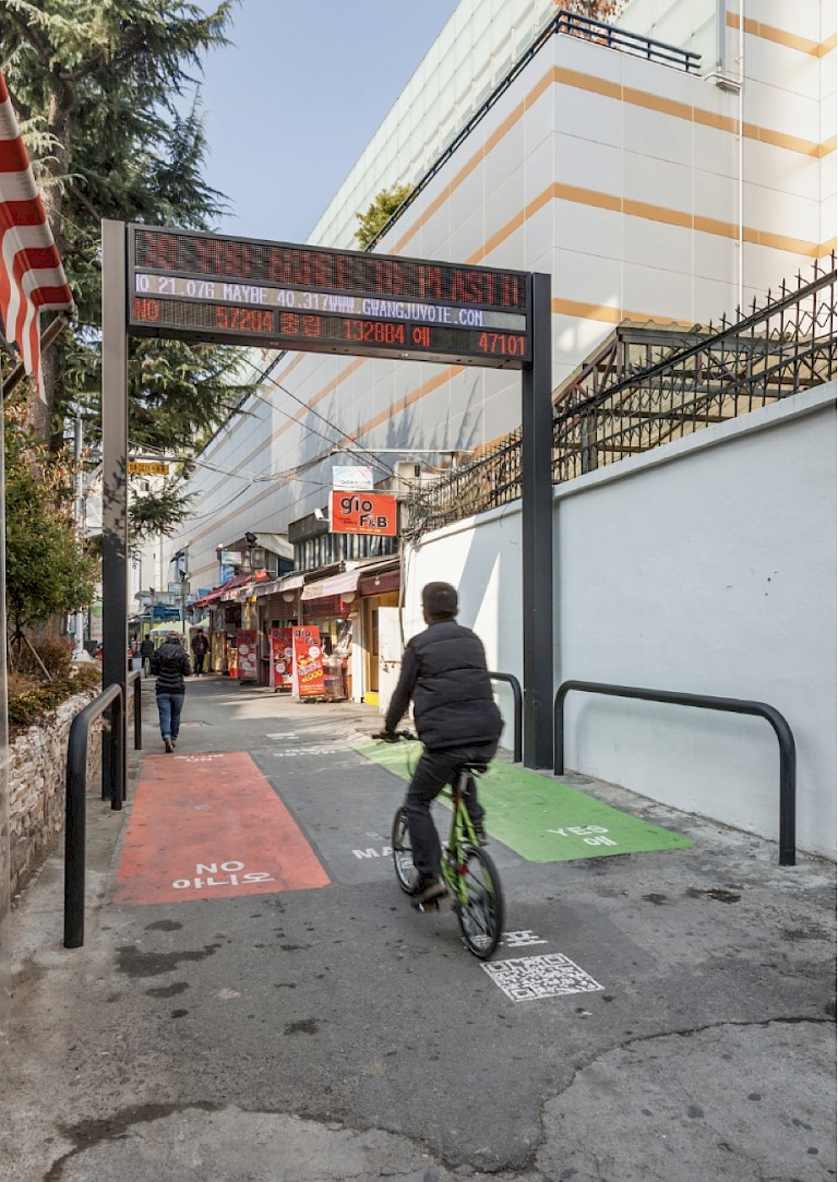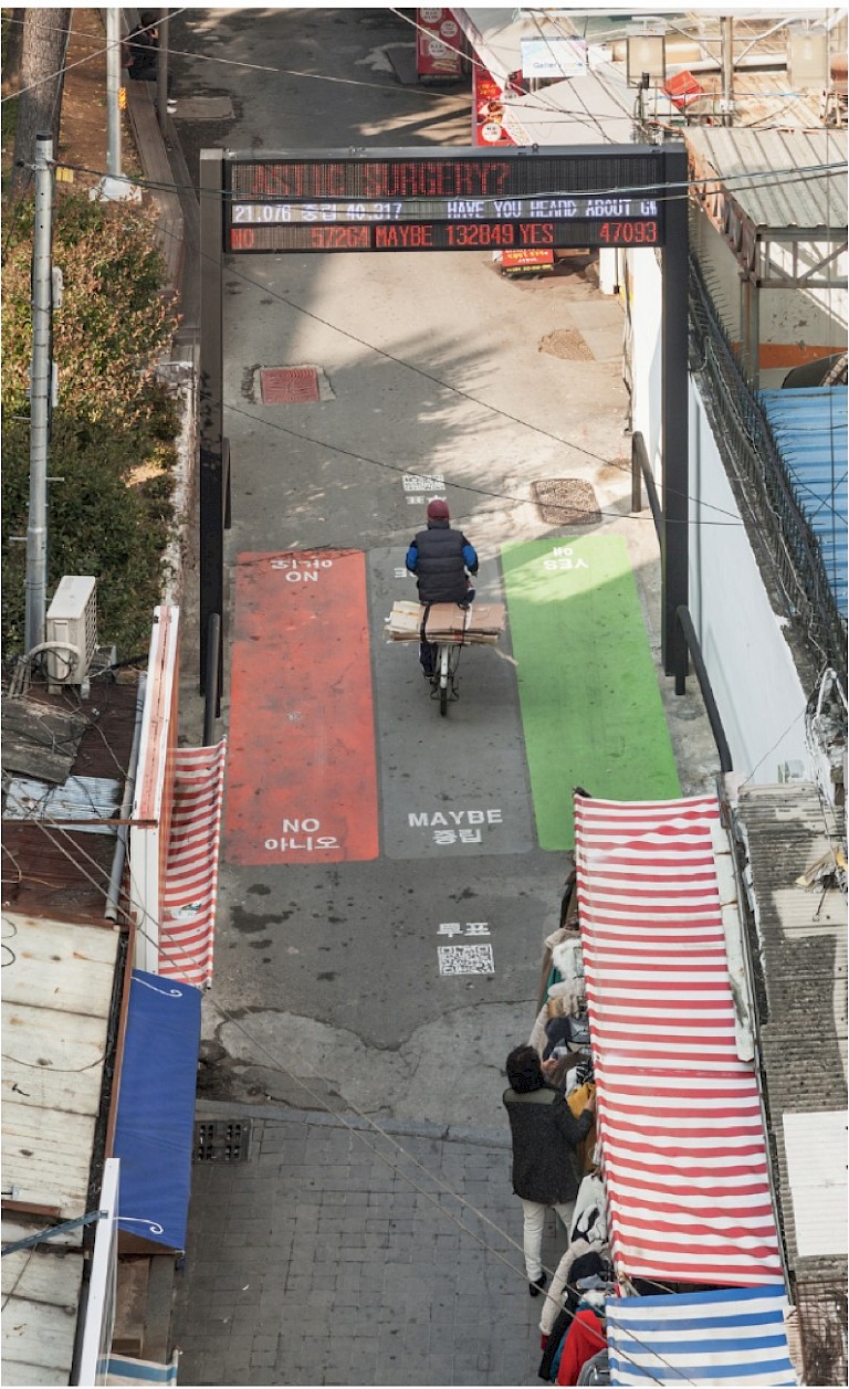 The work is shaped like a door frame and spans the entire street. Whether pedestrians or non-motor vehicles, it is inevitable to pass through one of the lanes marked with color. And each ""passing"" will be recorded by the sensor above the head and become part of the cumulative count. Therefore, whether intentionally or unintentionally, everyone becomes a participant in the voting. This seemingly passive form of participation creates equality and democracy among participants. While politically relevant voting still involves qualification checks (e.g., qualifications as “citizen”, or “resident” of the place), the artwork Vote truly addresses all those who live in the city and cross the street as voters, regardless of nationality or background, making “participation” a natural attribute and automatic involvement for everyone.