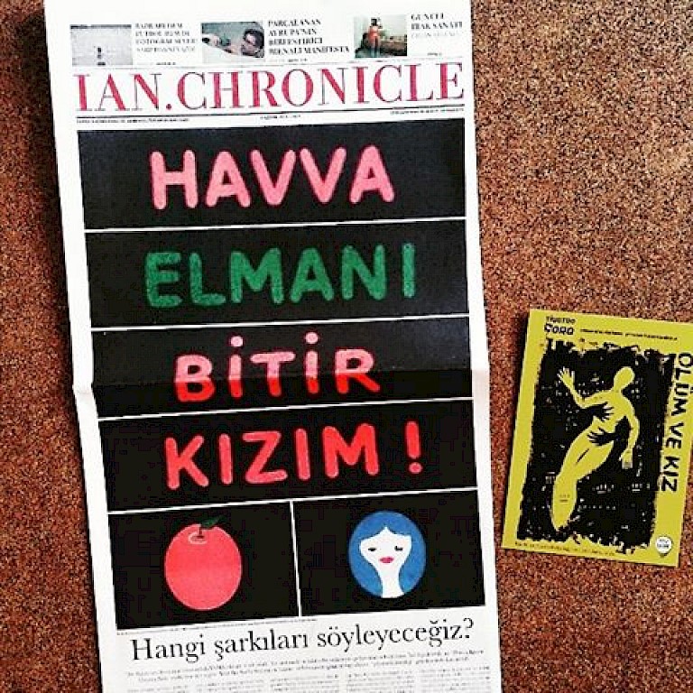 YAMA is a public art project in Istanbul that uses a 20 by 30 foot screen atop the Marmara Pera Hotel in Taksim as its platform. In 2016, the Turkish artist Işıl Eğrikavuk was commissioned by curator Övül Durmuşoğlu to create a work for the YAMA program. Time to Sing a New Song (TSNS) was the result, consisting of an animated video depicting an apple turning into a stylized woman’s face, alongside the text “Eve finish up your apple!” As the transformation of apple to woman is completed, the woman shuts an eyelid as if to wink at onlookers.