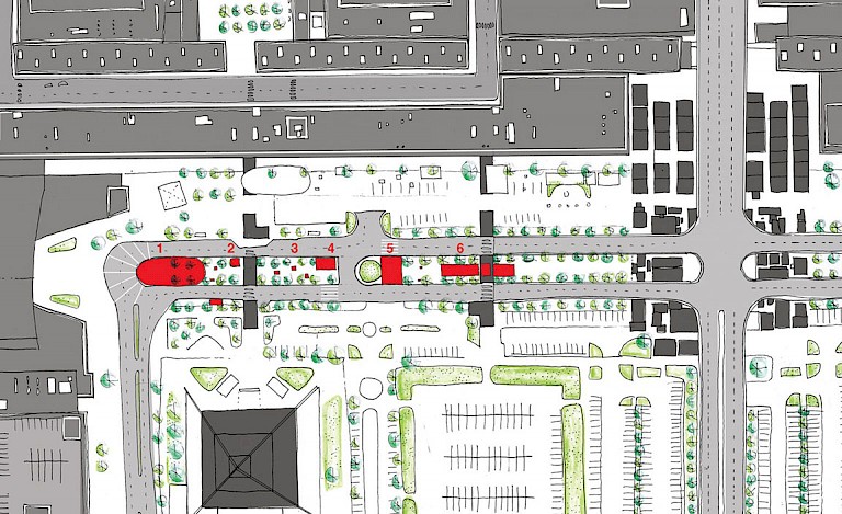 As in many preplanned cities such as Milton Keynes, there is a huge shopping centre (part of the original design). The art intervention was erected here. In essence, this place was chosen because it appears to be an actual city centre. It is basically the spot where buses normally come in, and turn around, dropping off the people at the shopping centre. Liesegang views the riders as arriving, and then "disappearing" into the shopping centre. In this, public life on the street is not visible, even though there are cultural institutions like a museum, a theatre, and a cinema.