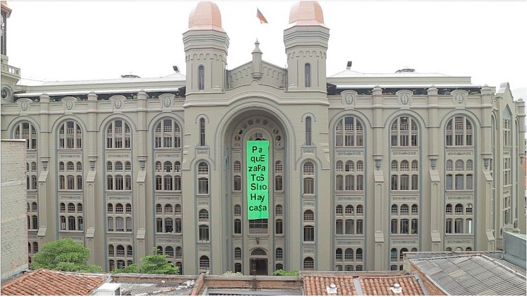 The project consisted of a 4 meters wide X 12 meters tall banner, almost like a vertical flag, that was surreptitiously thrown out a window from the National Palace (former government center now a shopping mall) with a phrase that stated, “Why shoes if there is no house”, a famous quote from the Rose Seller a 1990’s movie made in Medellin.