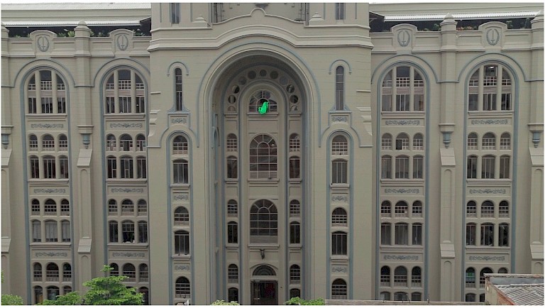 Adding a layer of sense to the action it was conducted during a Colombia soccer match for the World Cup qualifier. An event that is especially important for many sectors of society, especially for the working class. During the match, that implies that the security will be distracted and scarce in comparison to the amount of vigilance to which the Palacio de los Tenis is usually subjected to, the artist and his collaborators put up the banner in a window. The action is not done illegally in statal terms but surreptitiously to the non official power dynamics that operate in the city's downtown, and that through violence have erected the legitimacy over fear. because of this even after the work was executed in the public space it keeps being fulfilled through its narrative, in other words in the process for its development beyond its material result. It is this contextual condition the one that makes the whole operation more complex putting it in a place that goes further than just being an anecdotal action and transforms it into an aesthetic operation that keeps on operating. Because of all of this, the project implies a great challenge in its circulation in museo graphical terms since it is not enough with exhibiting its documentation.
