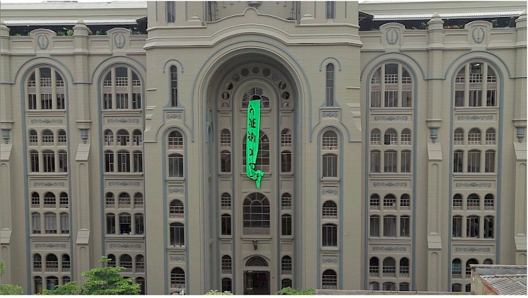One of the most important and powerful characteristics of this project is its illegal condition, in that sense the quick or “guerrilla” action installs an artistic / critical gesture which is ephemeral and manifests a reality that is mottled and contradictory. This project enquires in the symbolic of culture pop: the fluorescent green banner he uses is associated with the street marketing of the informal economies that circulate continuously the public spaces of the city's downtown. The phrase Pa’ que zapatos sí no hay casa (What is the need of shoes if there is no house?) comes from the movie by Victor Gaviria, La vendedora de rosas